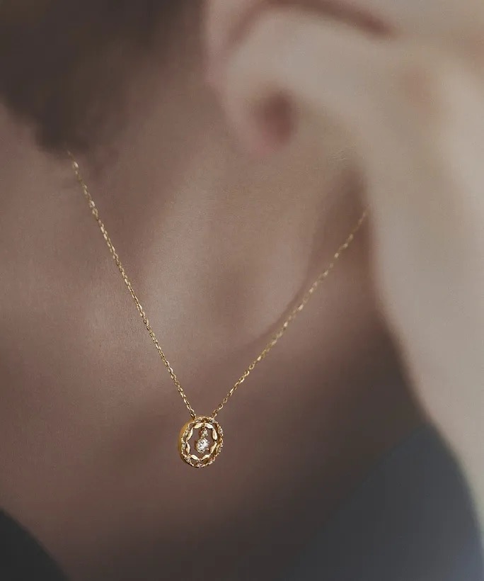 タイムレスに身に着けられる、ダイヤモンドの一粒ネックレス。ダイヤモンドの輝きが引き立つように、留め爪の造形にもこだわっています。ピンクゴールドの色合いと相まって、フェミニンで可憐なムードを演出してくれるでしょう。