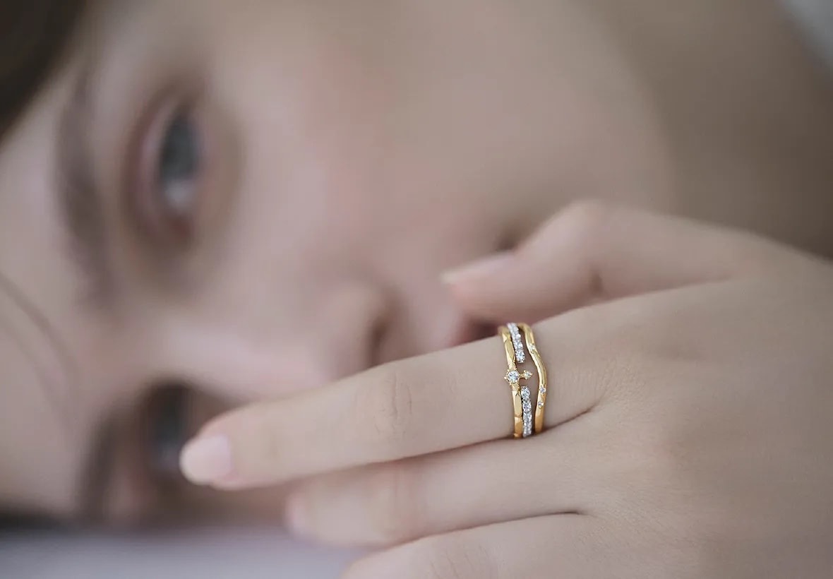 他のリングとの重ね着けも楽しめるハーフエタニティリング