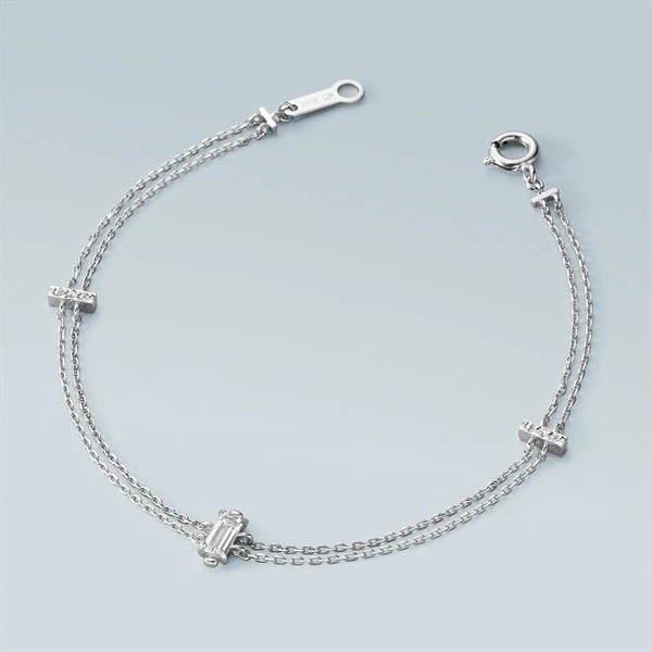 プラチナのチェーンに5石のダイヤモンドを並べたブレスレット。プラチナとダイヤモンドの輝きが、清楚さや凛としたムードを演出します。