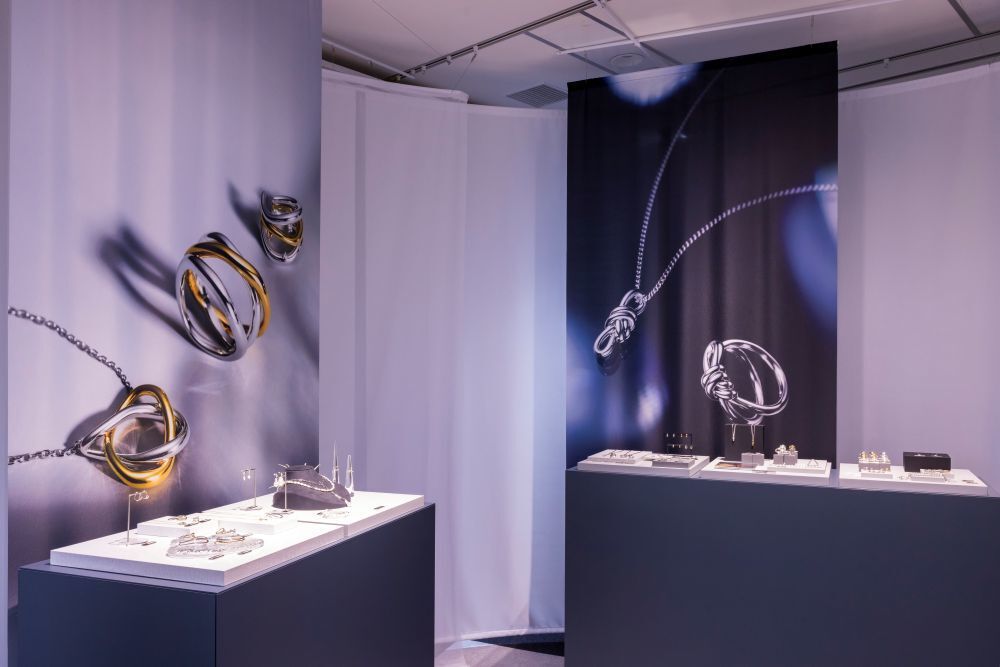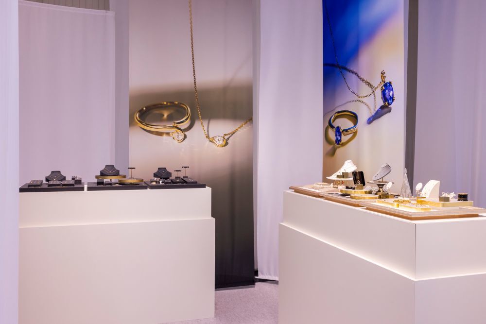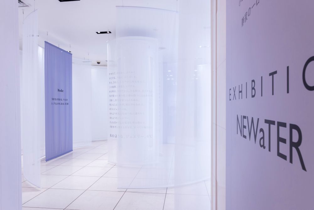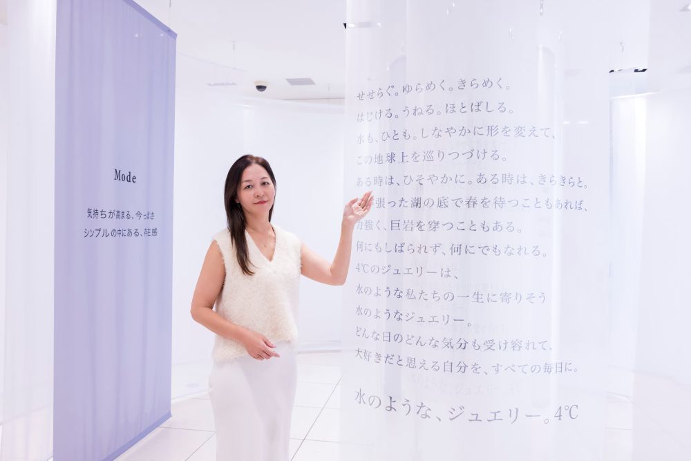 会場に一歩足を踏み入れると、白を基調とした空間に透明なヴェールが揺れ、“水の波紋”のように道筋を描きます。そのヴェールは水のように透け、奥へ進むたびに景色が重なり合い、変化していく仕掛け。水の一滴が波紋を広げるように──4℃の思想は静かに広がり、ジュエリーの一つひとつへと受け継がれています。