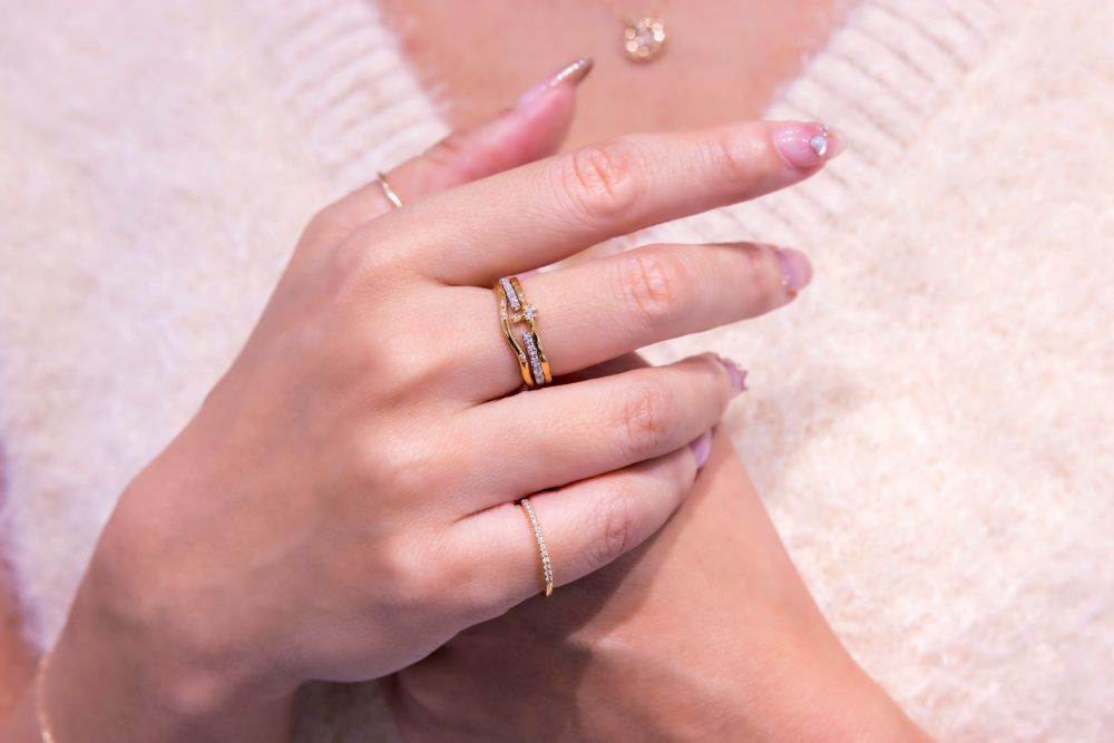 カラーMIXが洗練された3本セットのリング。センターにトパーズをあしらった雪のきらめきを思わせるリングと、朝の日差しを表現したリングを重ね合わせることで、華やかなコーディネートが完成します。