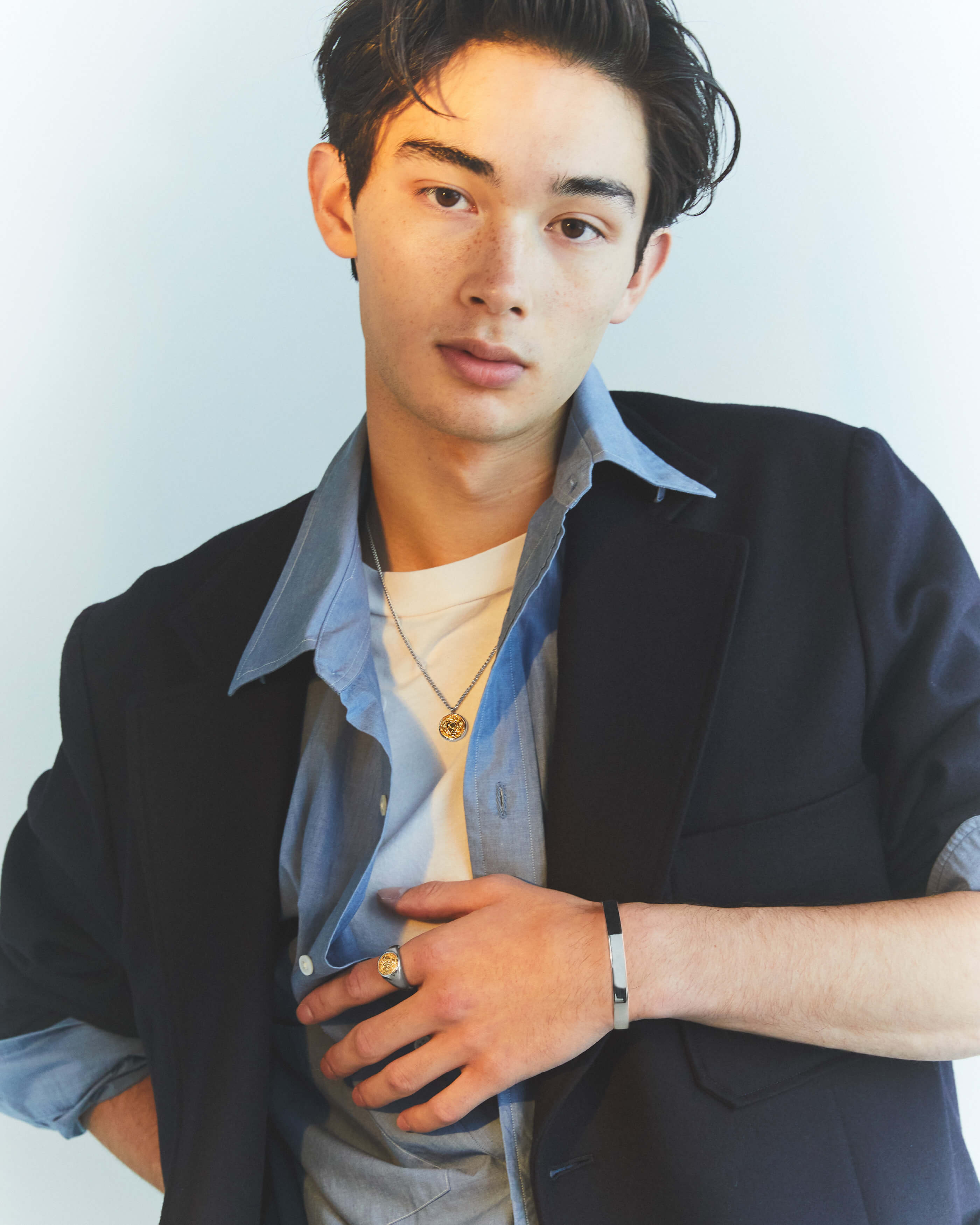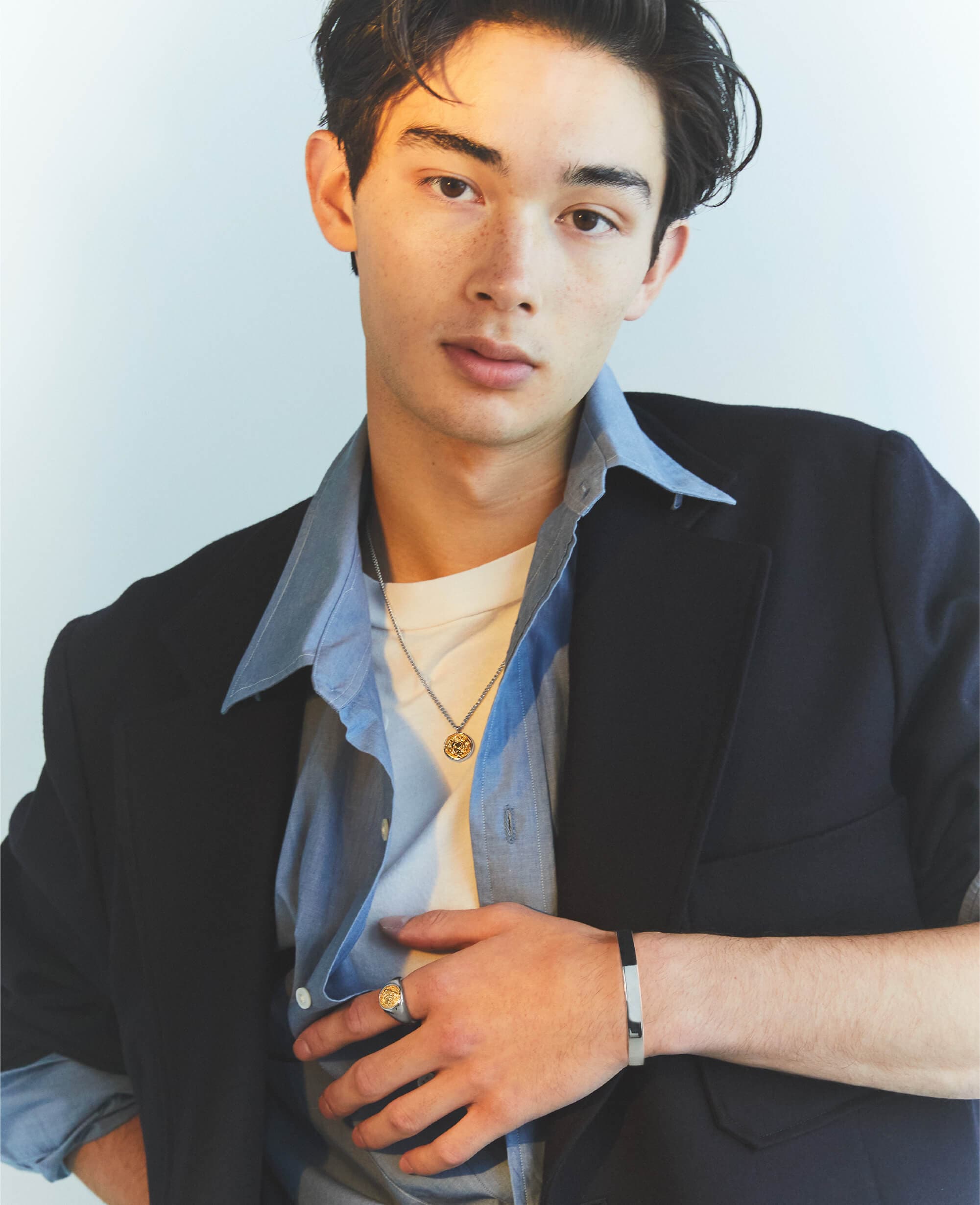 ゴールドカラーとシルバーのコンビがキャッチーなコインリングと、同デザインのネックレス。Tシャツやスウェットに合わせるだけでももちろんサマになるけれど、トレンドのトラッドスタイルとの相性が抜群にいい。 せっかくのお気に入りのジュエリーは、パリッとした紺ブレに合わせて、少しだけ“おめかし”してみるのはどうだろう。シャツのボタンは上まで留めず、白Tを仕込んであくまでラフにまとめるのがしゃれて見えるポイントだ。