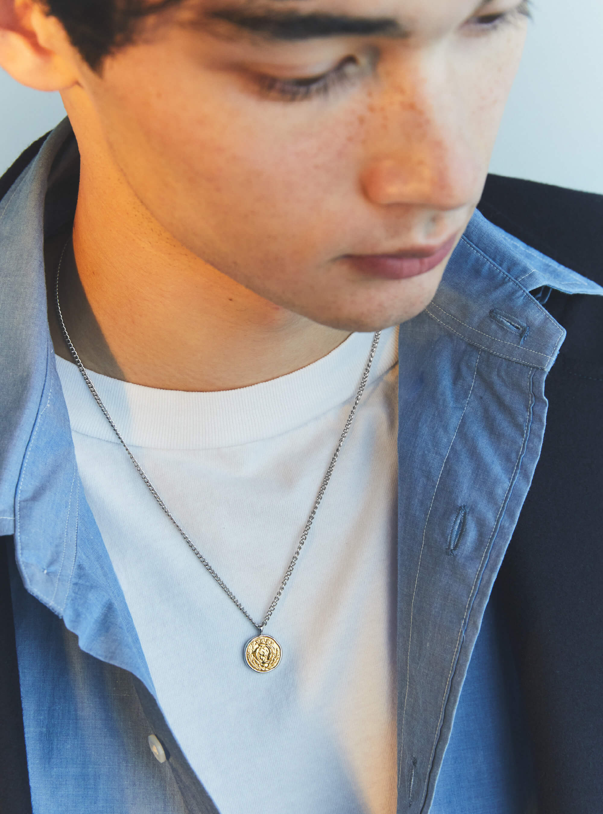 ゴールドカラーとシルバーを組み合わせたネックレスは、着こなしに奥行きをもたらしてくれる。コインには、身につけた人に幸運をもたらしてくれるといわれているギリシャ語でイクトゥスと呼ばれる魚のモチーフを採用。“お守り”代わりのジュエリーとして相棒にしたい。