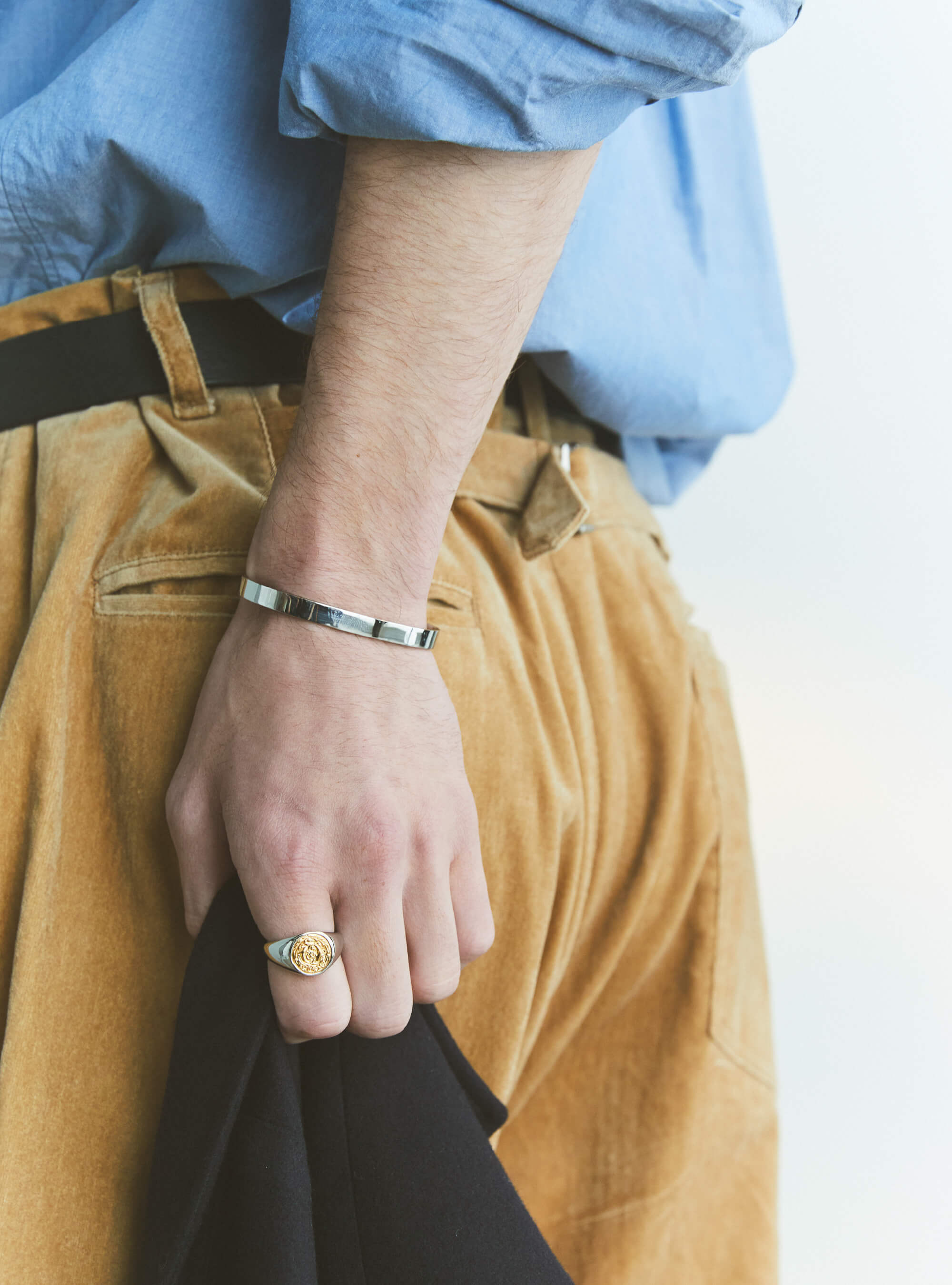 ラフにまくった手もとも、繊細なブレスレットがあればぐっとエレガント。タイトでなく、ゆるっとしたサイズ感のものをつけることでリラックスした印象に。指先に溶け込むリングは、シルバーとゴールドカラーを重ねづけ。細めだから重ねづけしてもゴツく見えず、上品さをさらに後押ししてくれる。