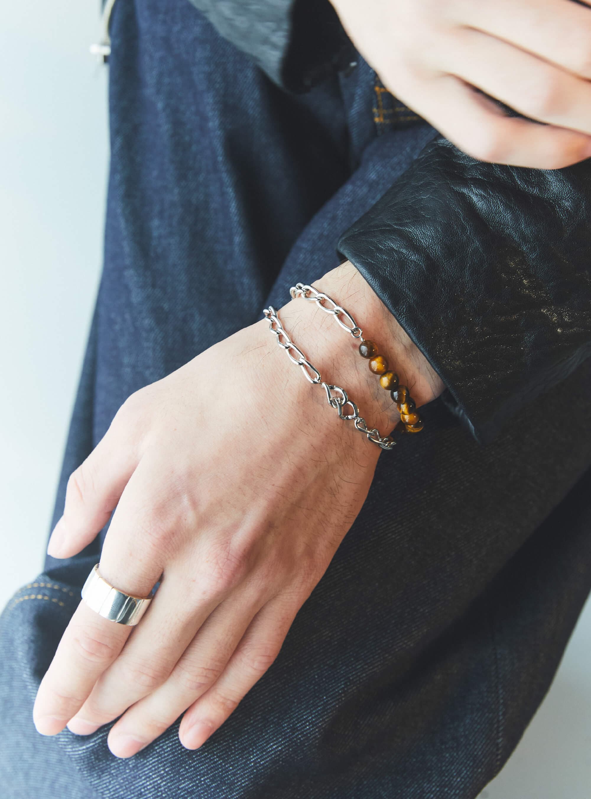 センターに“しずく”からインスパイアされたモチーフを配したチェーンブレスレットと、“タイガーアイ”というストーンを用いたブレスレットをレイヤード。シャープなラインが刻まれたシンプルな太いリングと合わせることで、盛った手もとにまとまりが生まれる。