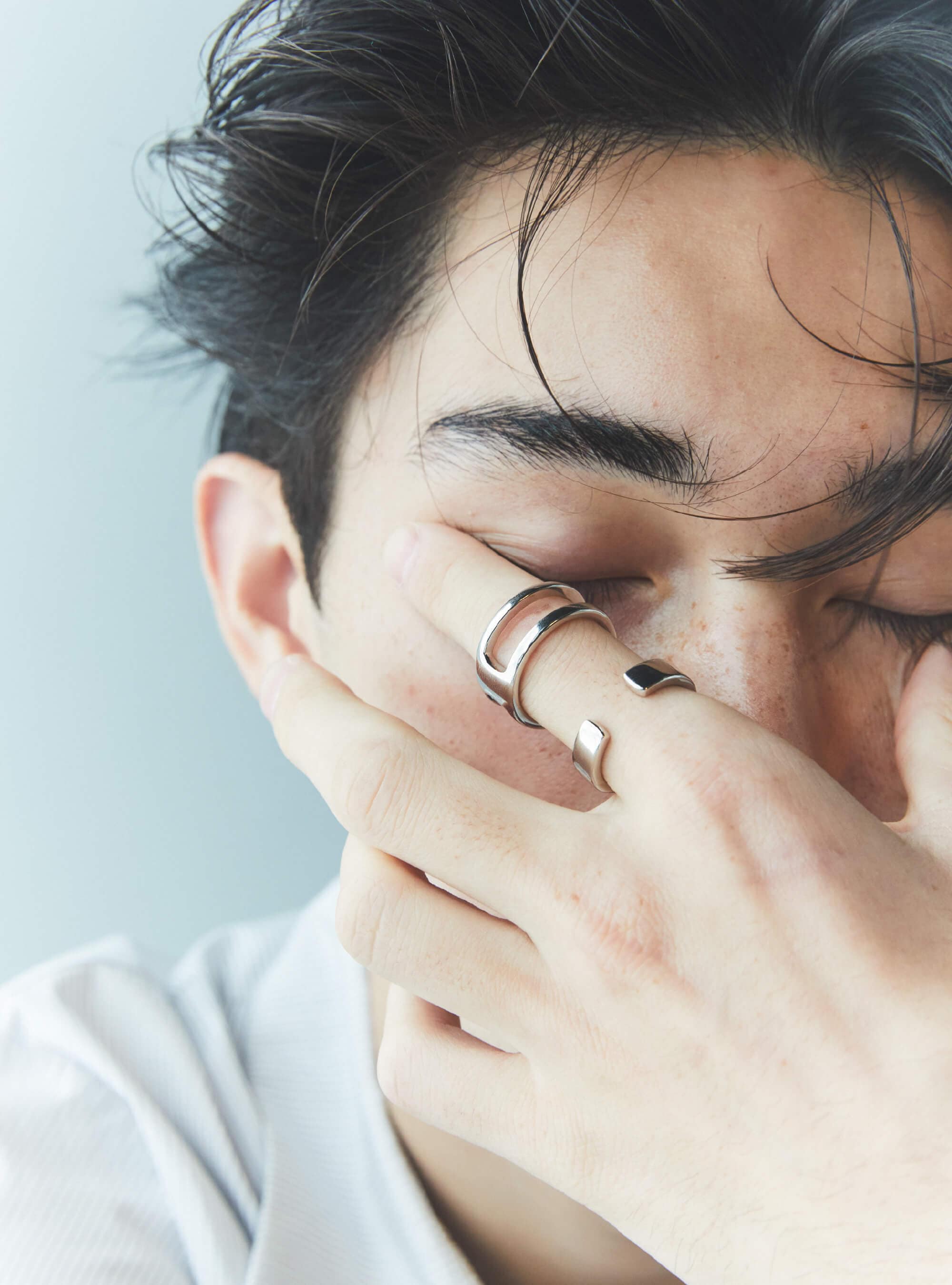 セパレートして別々につけることができる2WAY仕様のリング。2つのリングを組み合わせたまま主役級の存在感を楽しむのはもちろん、バラして使ってもこんなふうにしゃれて見える。ときには、あの子と1つずつシェア……なんていう、ジェンダーレスなジュエリーならではの使い方もできる。