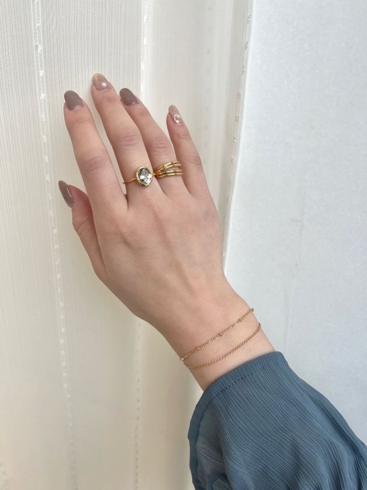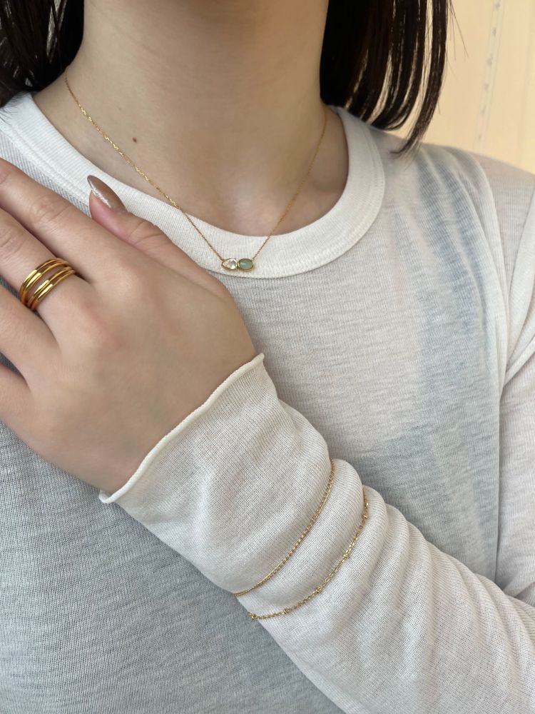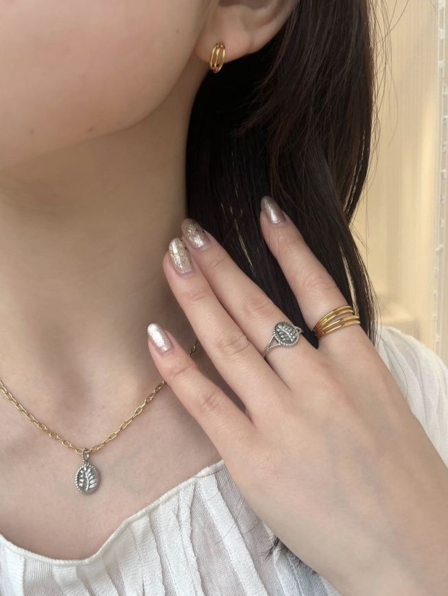 イエローゴールドでハンサムな印象にしてみました。一石ピアスとイヤーカフの組み合わせはバランスがとりやすいのでおすすめです。