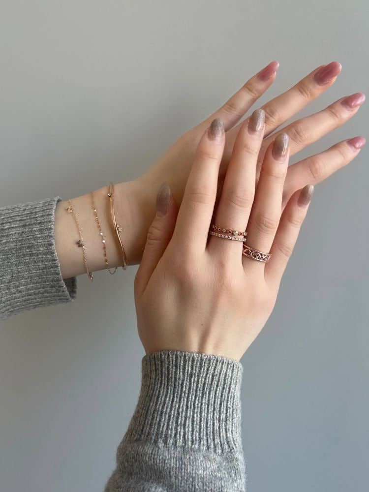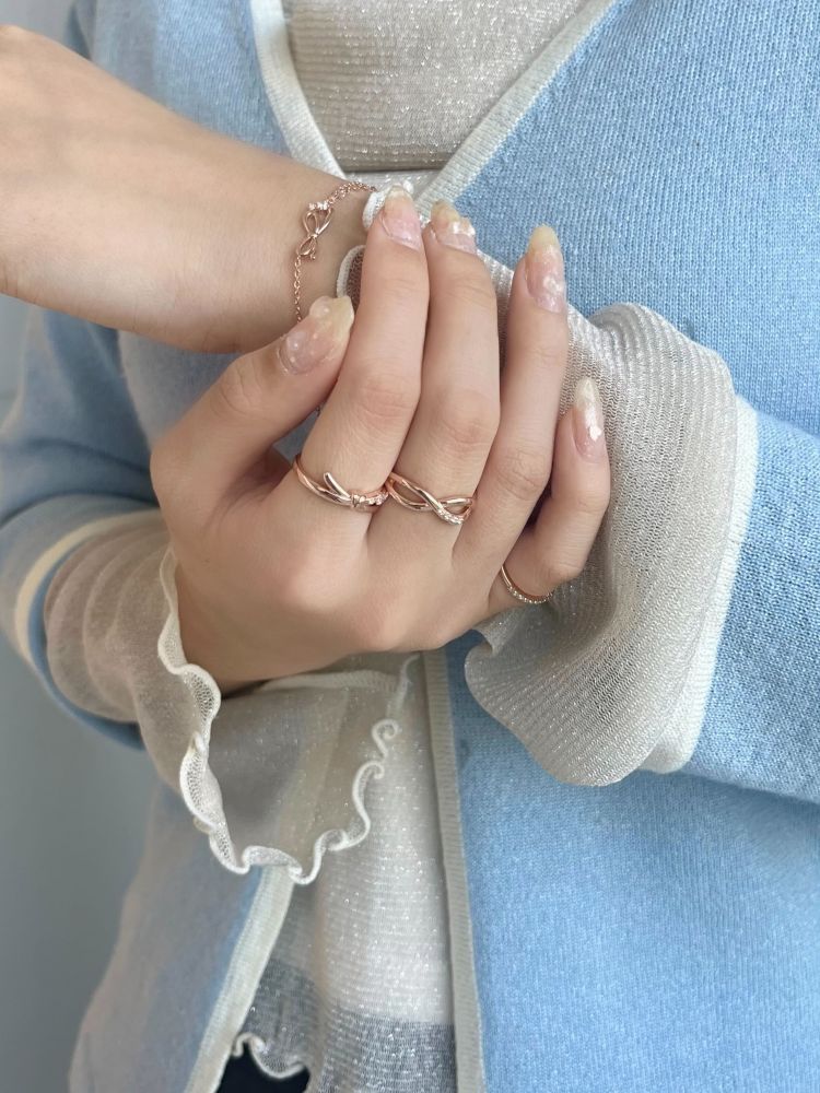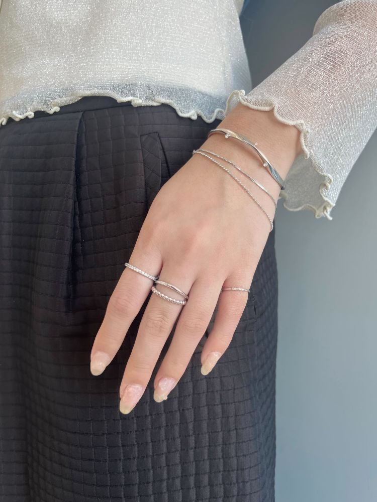 地金の艶やかさが魅惑的な贅沢ジュエリーでコーディネート。細部までこだわったジュエリーだからこそ感じる光の照り返しと、トレンドをおさえたパールアイテムは相性抜群です。
