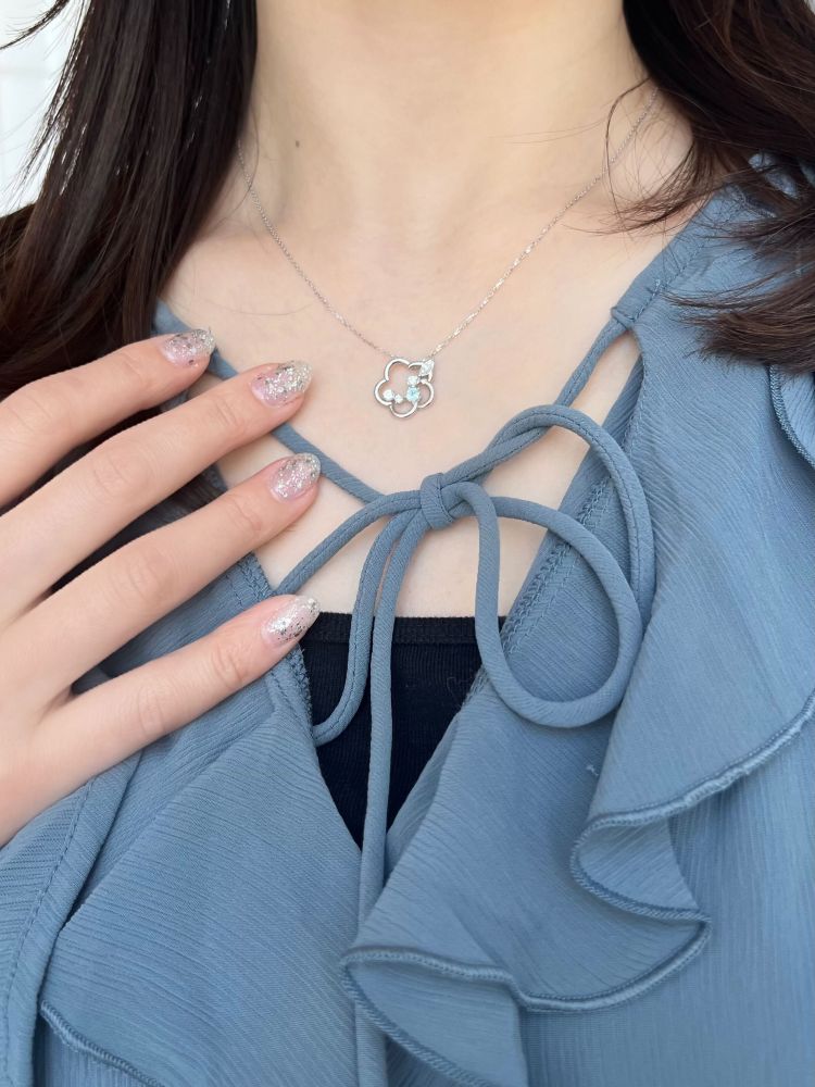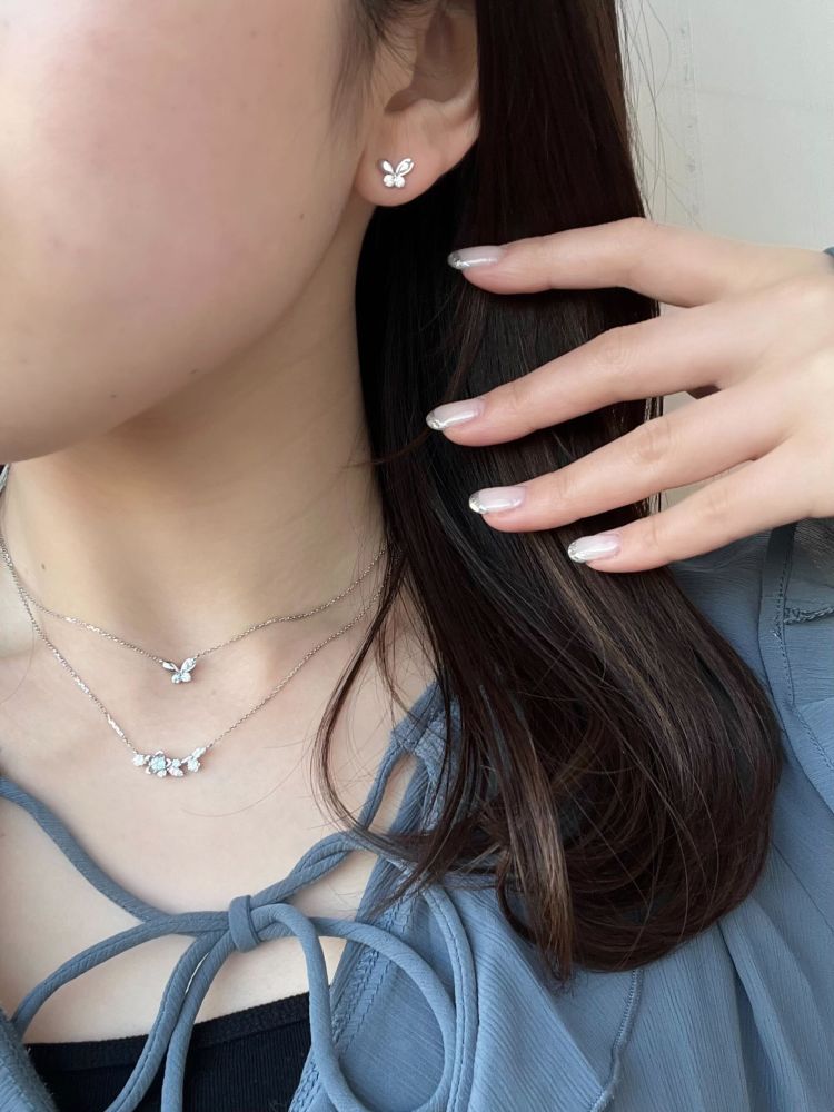 表情の違う輝きを楽しめるピアスと、艶やかな輝きを放つイヤーカフのコーディネート。ナチュラルな雰囲気のジュエリーは、毎日のコーディネートに自然に溶け込みます。