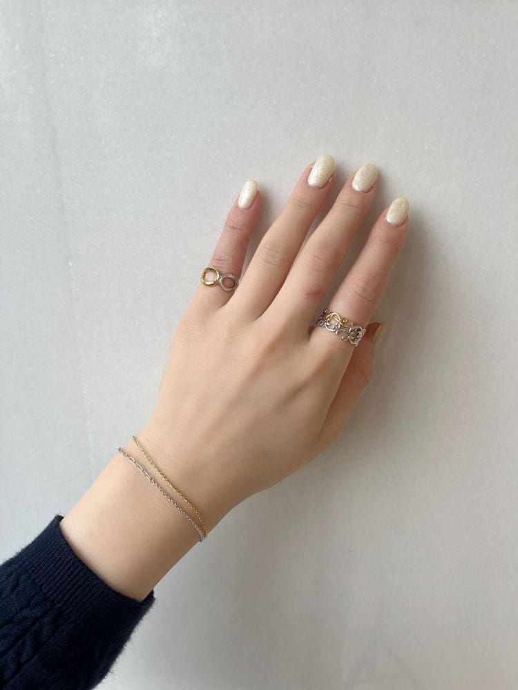 粒の揃った石使いで冬空に雪が舞う様子を連想させるコーディネート。透明感のあるフェルスパーと、水色のキュービックジルコニアがきらめくリングは、シンプルなデザインのジュエリーと合わせることで主役級のアイテムになります。