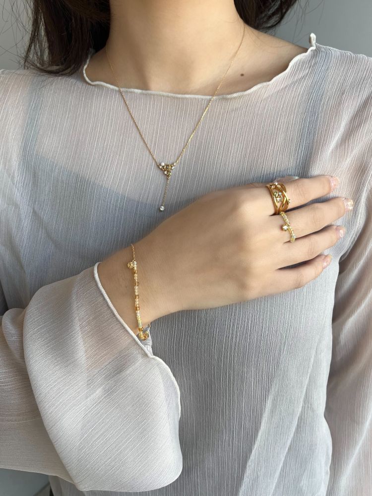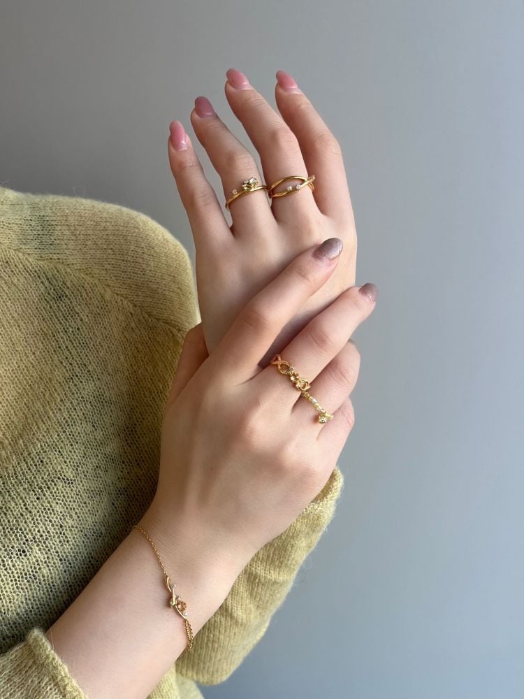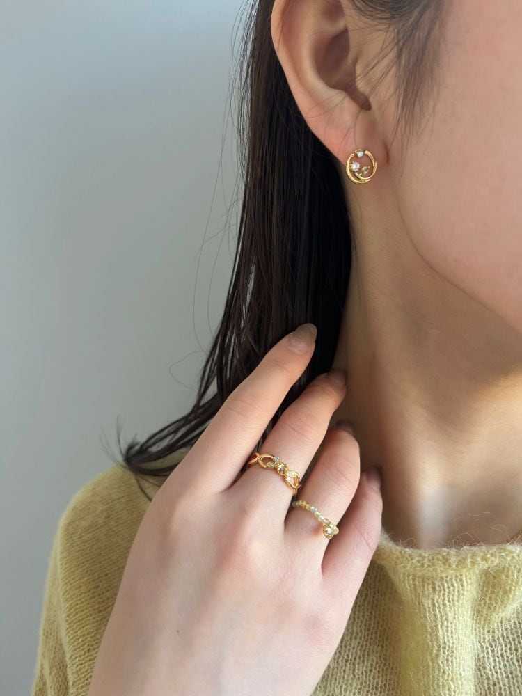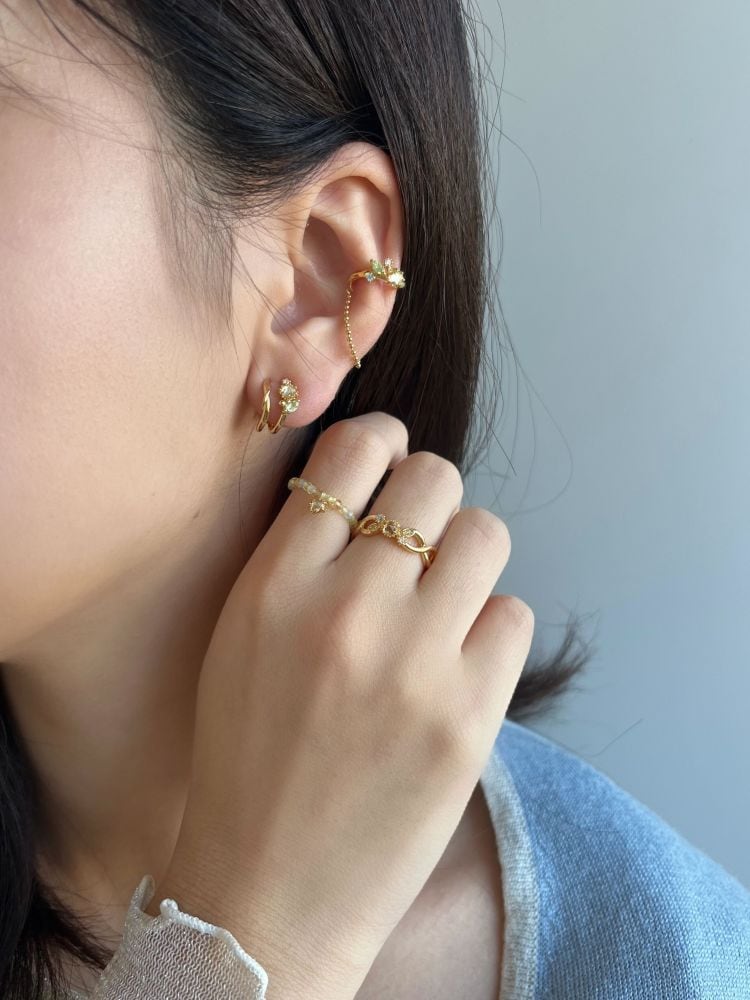 Christmas限定のEarJewelryを主役にしたコーディネートかすみ草をイメージした限定のセットジュエリーはイヤーカフ・ピンキーリングの2Wayで着けられるのが嬉しいポイント。ピンクゴールドカラーの上品なカラーが、ロマンティックなクリスマスのひと時を、華やかに彩ってくれます。