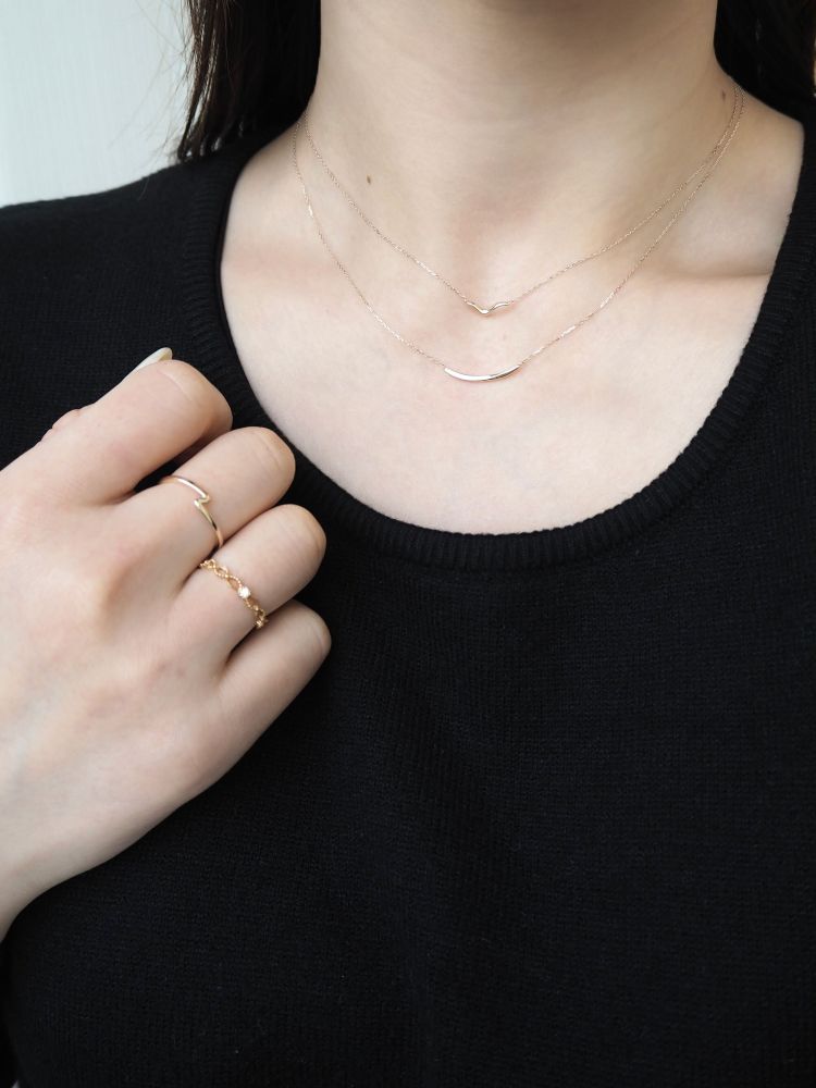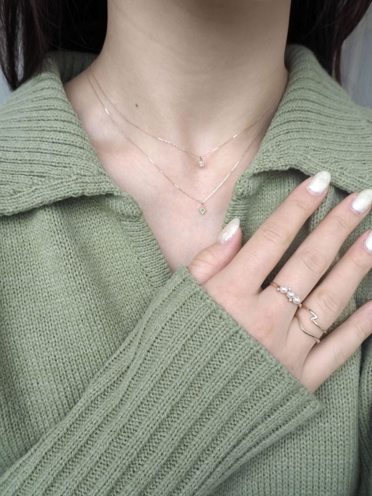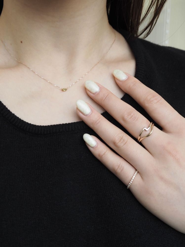 貝殻をモチーフにしたジュエリーでコーディネート。ピンクゴールドコーティングの色合いとパールの石遣いが、柔らかな印象を与えてくれます。