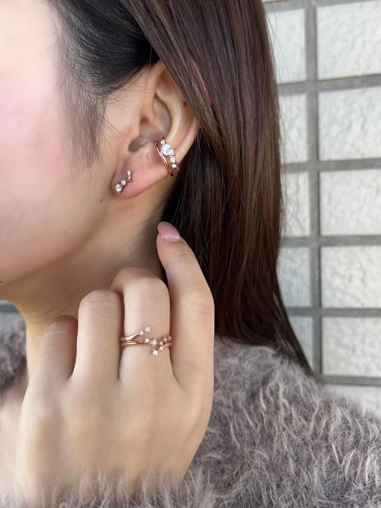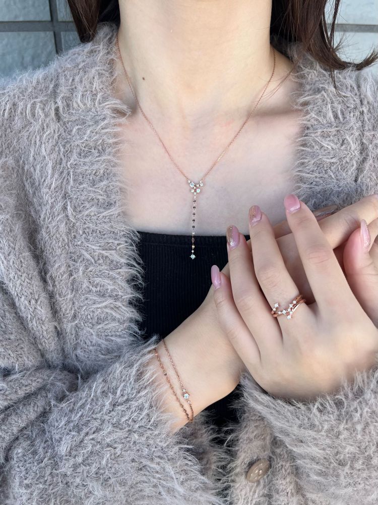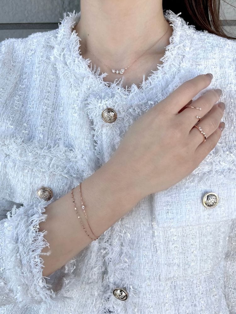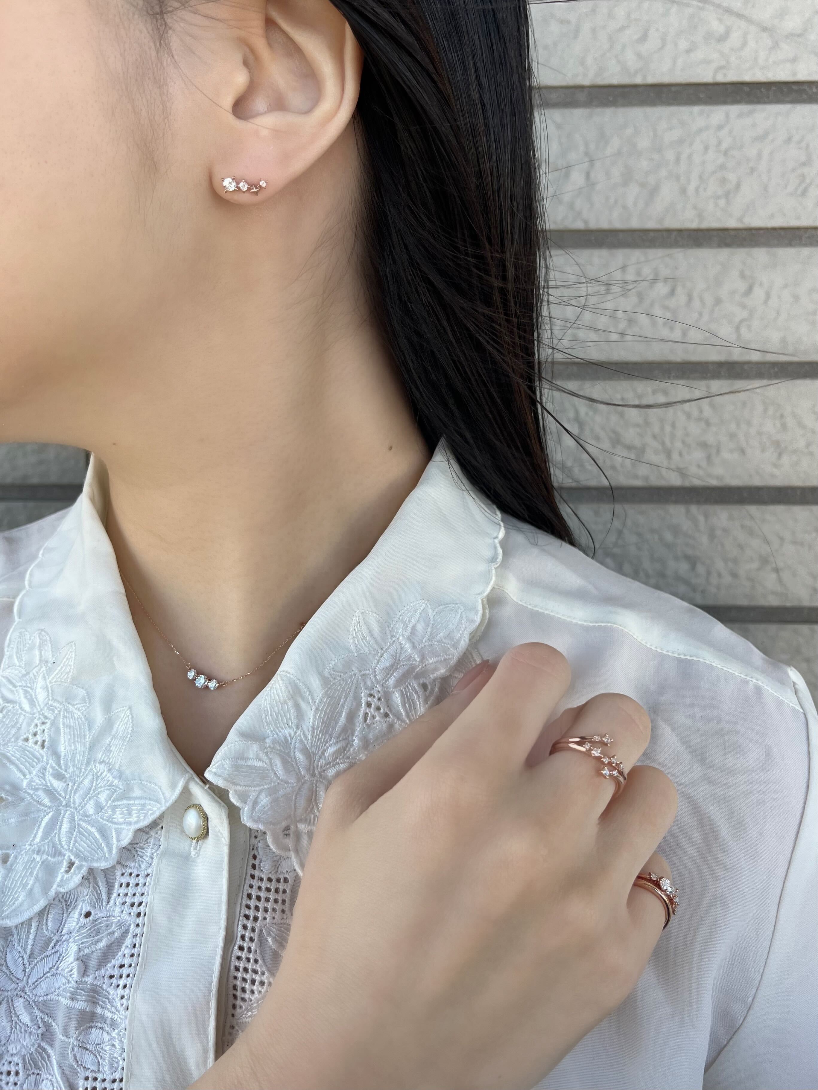 オンライン限定の一粒ダイヤモンドのネックレスに、軽やかな着け心地が魅力のチェーンリングを合わせたコーディネート。シンプルなジュエリーは、デザインのあるトップスとも相性が良く、毎日のコーディネートをより楽しむことができます。
