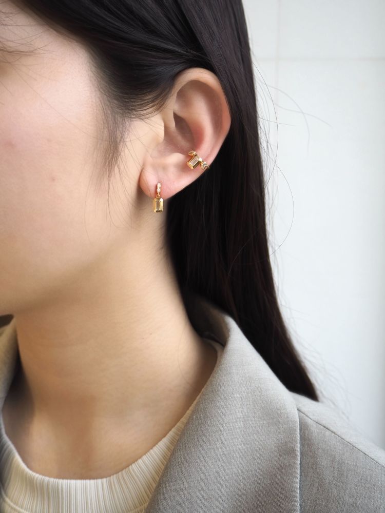 ストライプシャツ×テーラードジャケットに、ネックレスでクリーンな華やぎを。横並びのデザインのモアサナイトのネックレスが主役。ダイヤの約2.5倍の輝きを放つモアサナイトが、ベーシックな装いに華やぎを添えます。耳元は、片側にスターダストを効かせたクロスラインのイヤーカフを。包み込むカーブが立体感を生み、さりげなく華やかに。知的な装いにきらめきをひとさじ。大人のスマートカジュアルに。