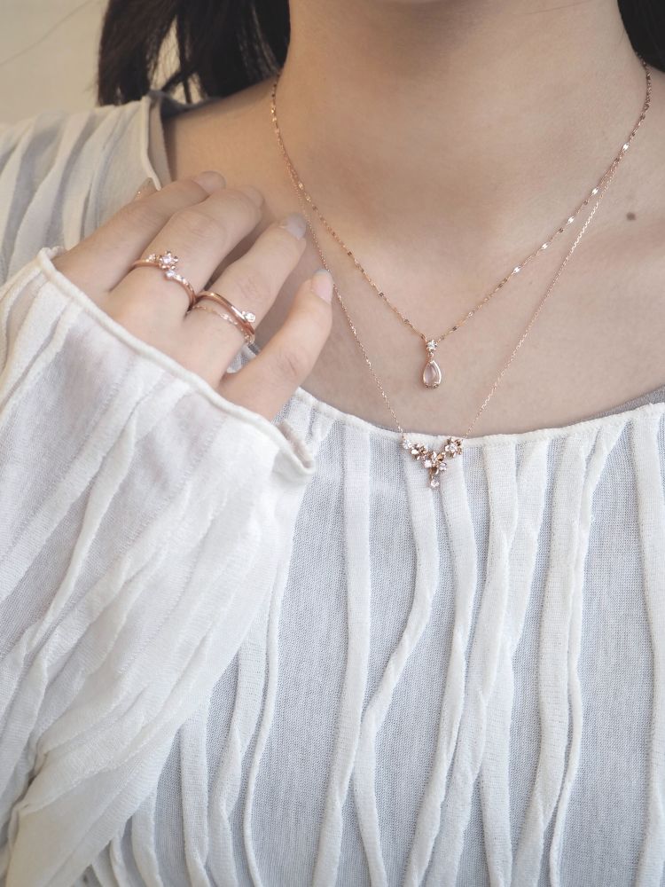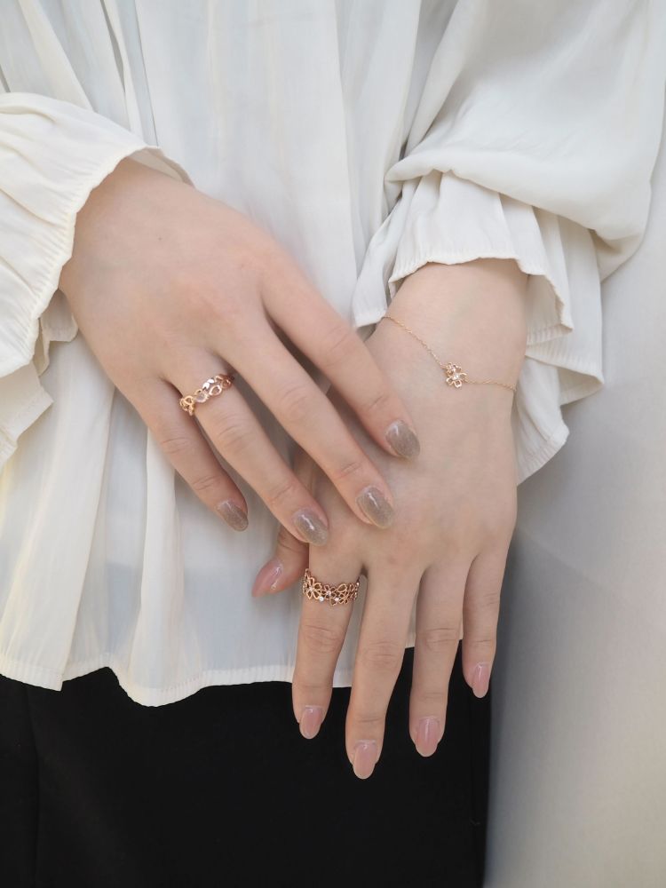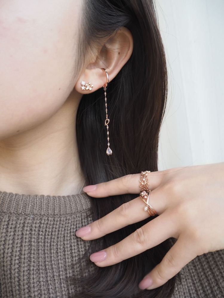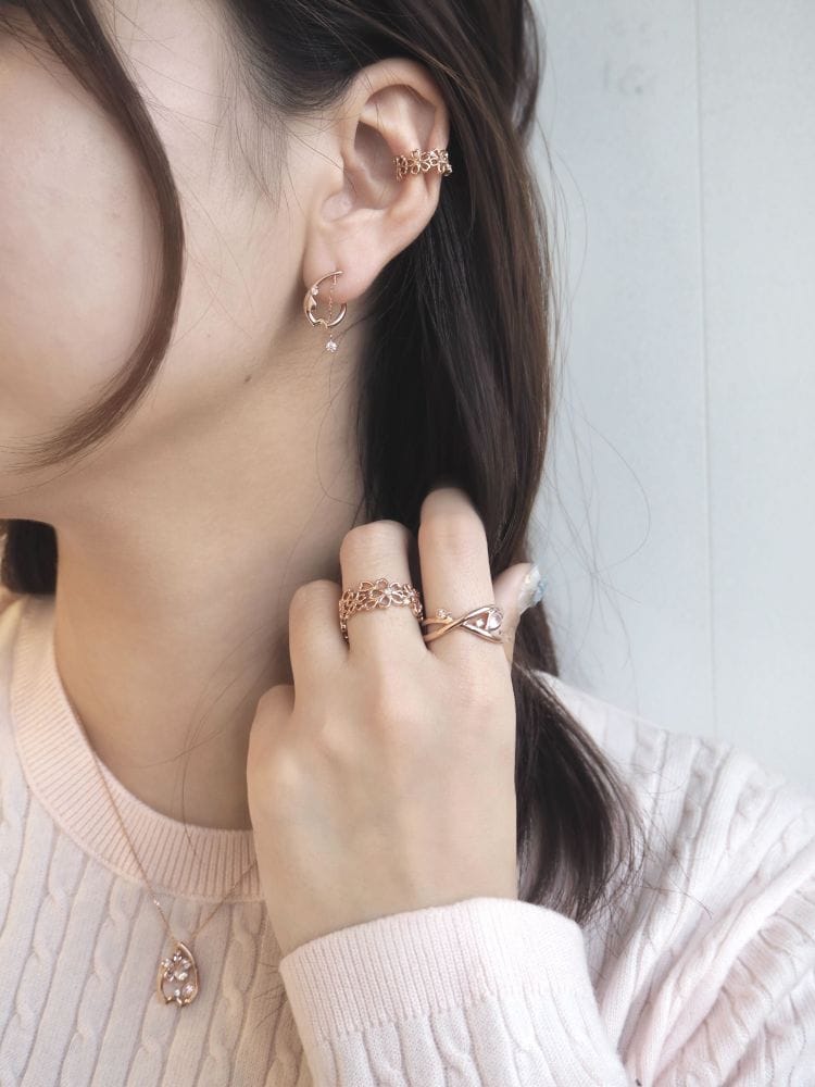桜と空が重なり合う一瞬の情景に、春の想いを映した桜ジュエリーコーデ。耳元を彩るのは、桜の5枚花が寄り添うデザインが可憐なフープ風ピアス。ピンクやラベンダーカラーのストーンが夕暮れ空を想わせ、大人の可愛らしさを引き立てます。指先には、華奢なウェーブラインのリングとペタルチェーンが揺れるリングの2本セットを、別の指にそれぞれ合わせて。桜の柔らかな色合いが生み出す優しい輝きが、春らしい温もりを添える、華やかさと上品さを両立したジュエリーコーディネートです。