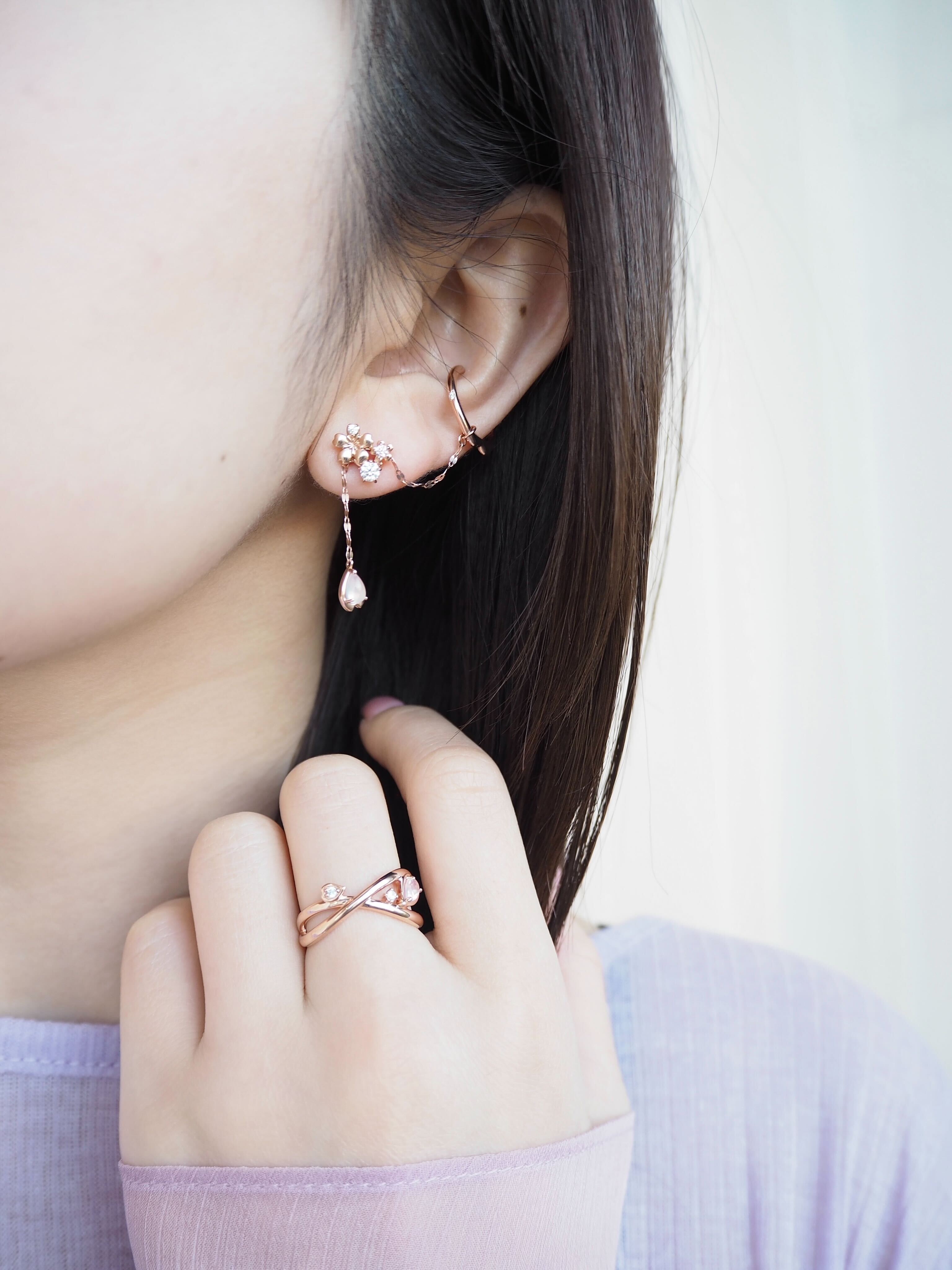 花びらのような柔らかなラインが特徴のクロスリングには、優しいピンクのローズクォーツが寄り添い、指元に春のきらめきをプラスします。