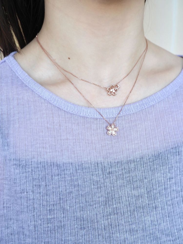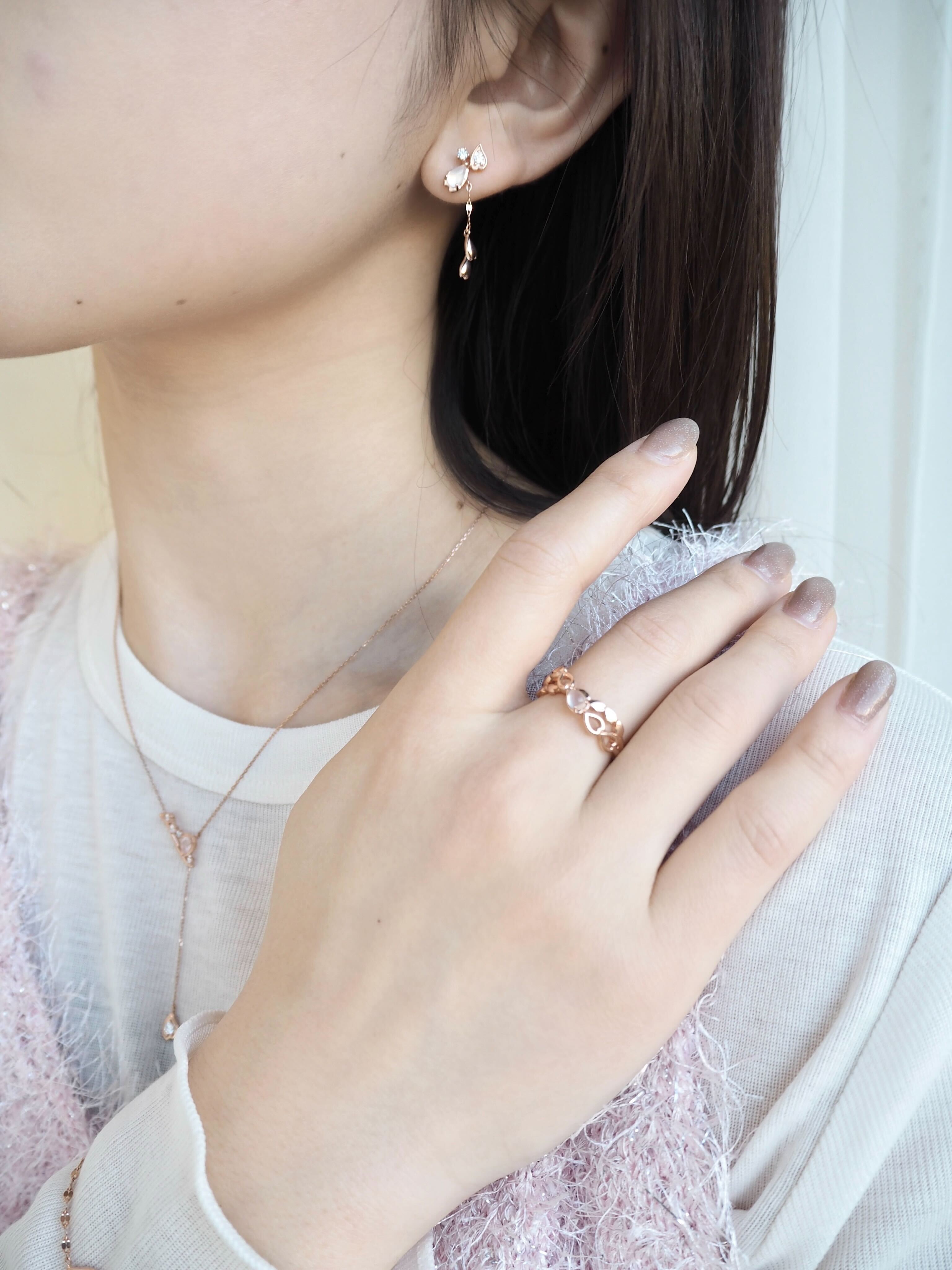 桜と空が重なり合う一瞬の情景に、春の想いを映した桜のジュエリーコーデ。