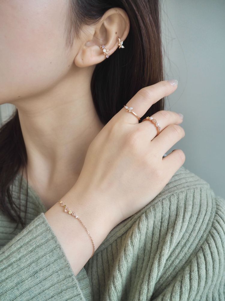 春の訪れを感じる軽やかなジュエリーコーディネート。ネモフィラをイメージした花のフレームが美しいネックレス。ブルーのトパーズとクリアなキュービックジルコニアが寄り添い、胸元に爽やかで透明感のある輝きを添えます。ロジウムコーティングの艶めきと優しいデザインが、春らしい軽やかさを演出。動きのあるトップスと合わせた、季節感を引き立てるスタイリングです。