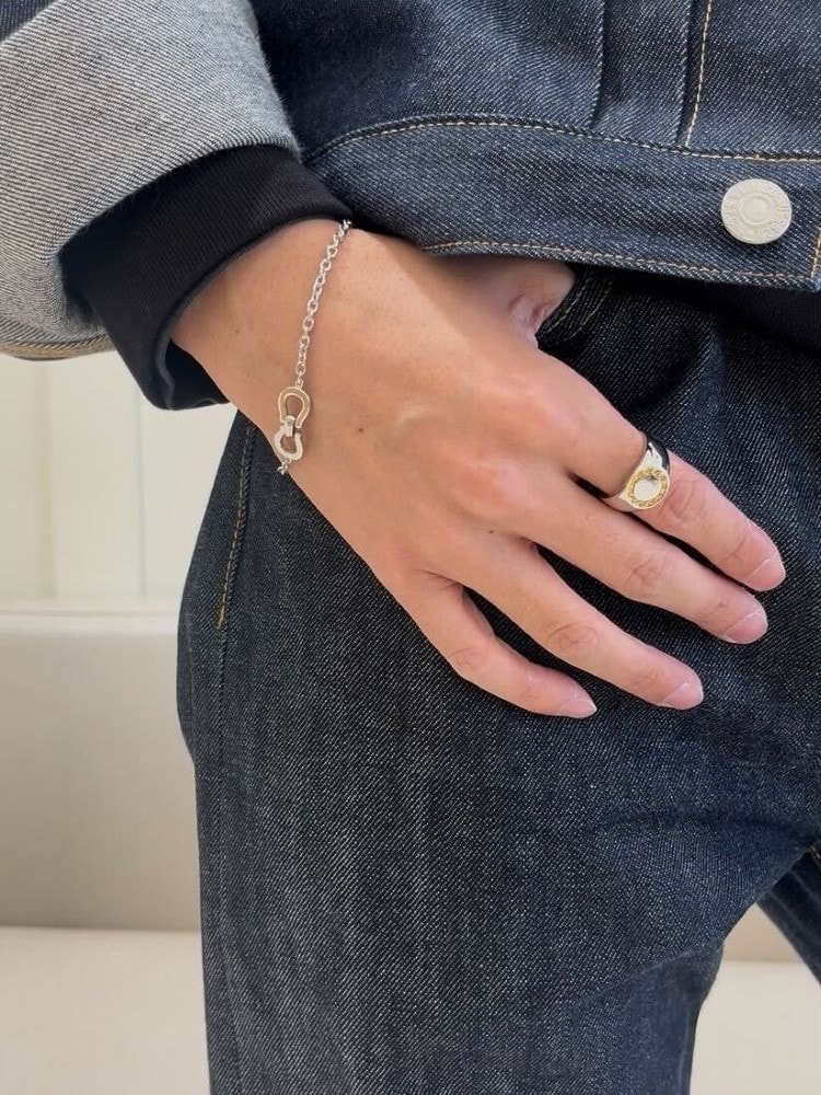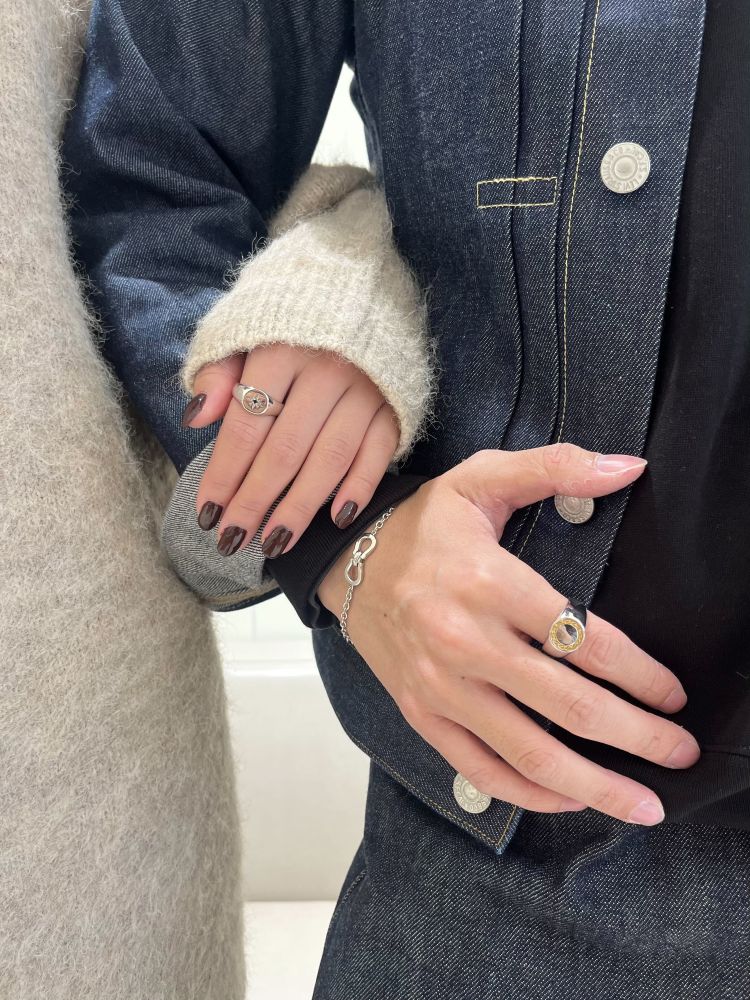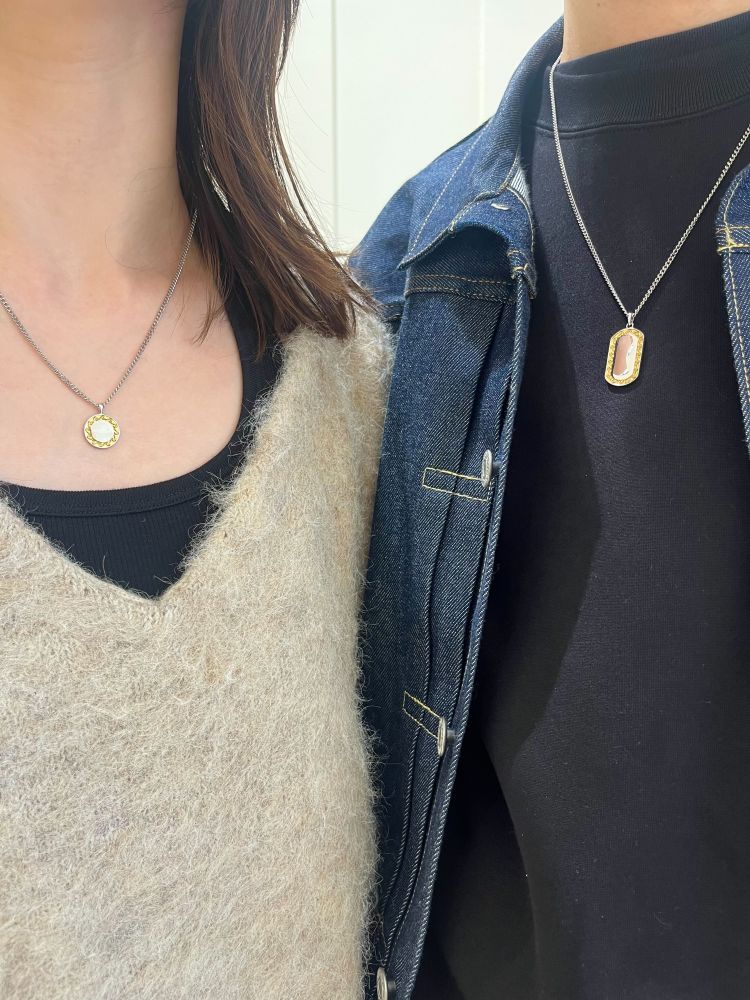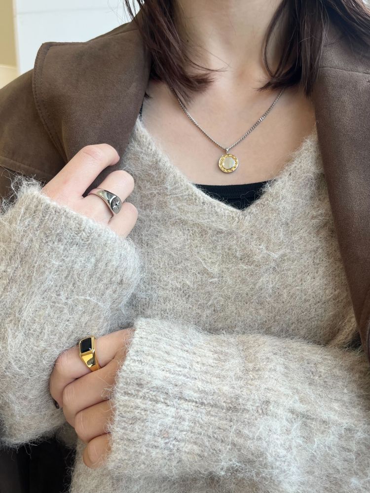 ハートが主役のコーディネート。地金のジュエリーと合わせると甘すぎずにいいバランスで身に着けられます。