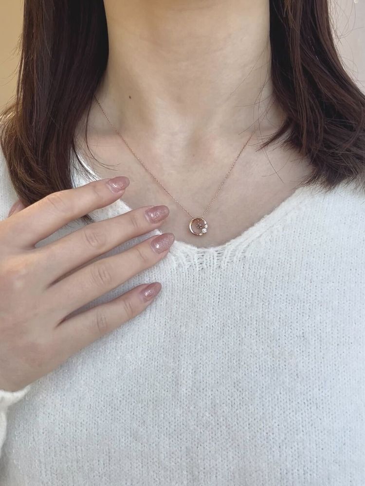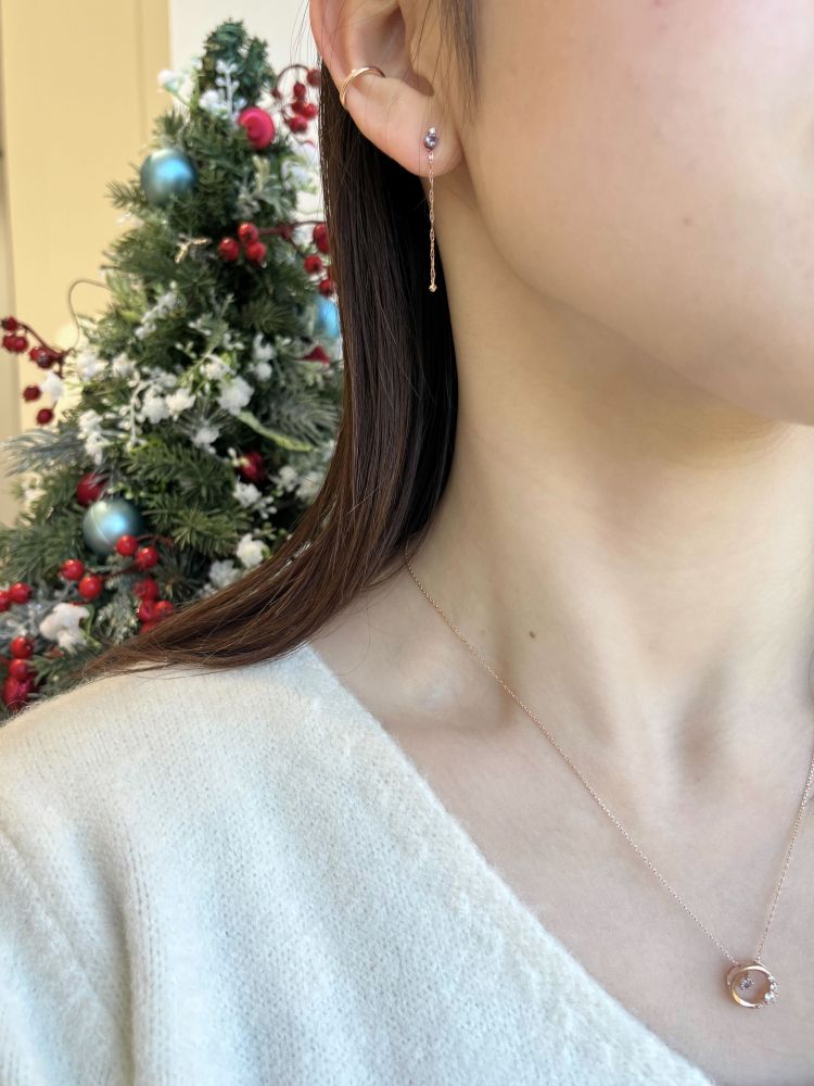 パールがお顔周りに明るい印象を添える、どのようなファッションにも合わせやすい上品なコーディネート。