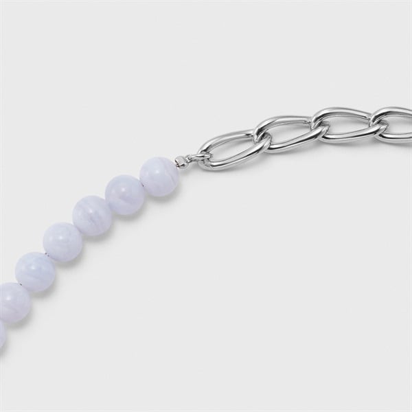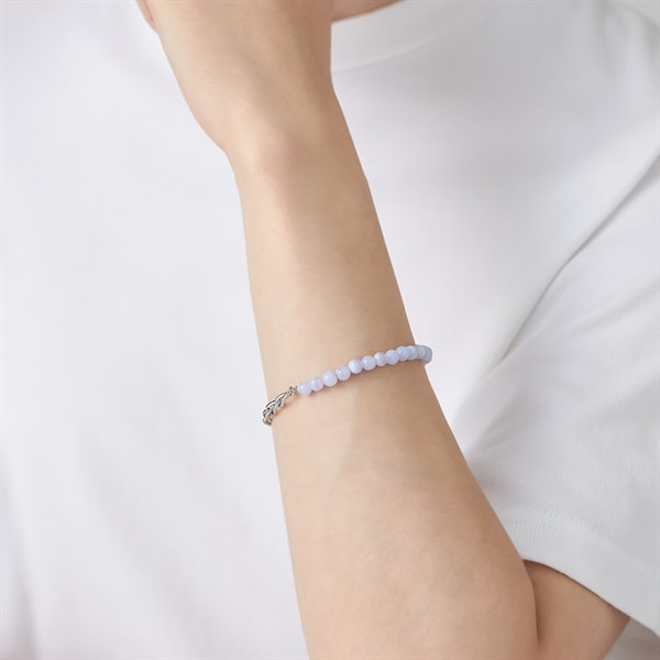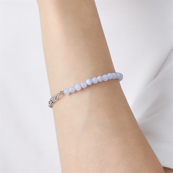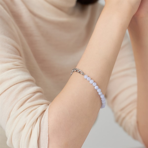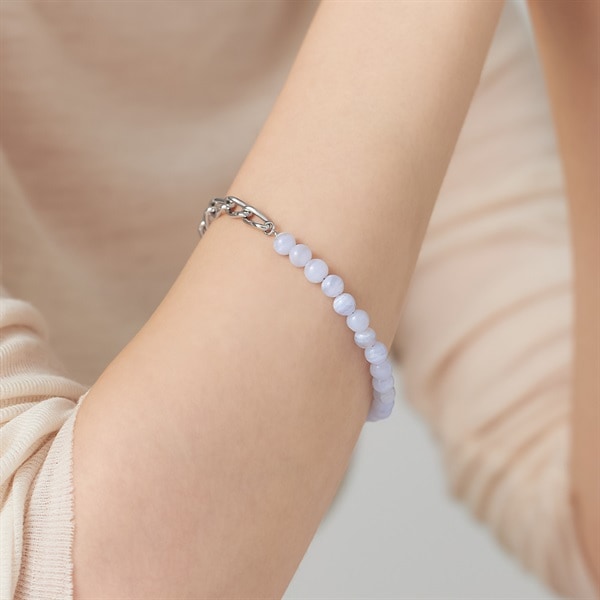 【Colored Stones】 丸玉ブルーレースの縞模様がさわやかなブレスレット。淡い水色と白色が層状に重なり、繊細なレースのように見えることからブルーレースと名付けられました。 チェーンの光沢とナチュラルなカラーストーンの質感が楽しめるジュエリーならではの上質さを兼ね備えたデザイン。チェーンの1コマずつで長さ調整可能。お好きな長さで楽しめます。 ※天然石・天然素材を使用しているため、実際の色味や風合いが異なる場合がございます。