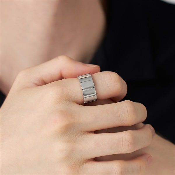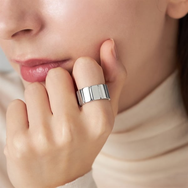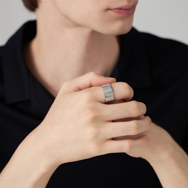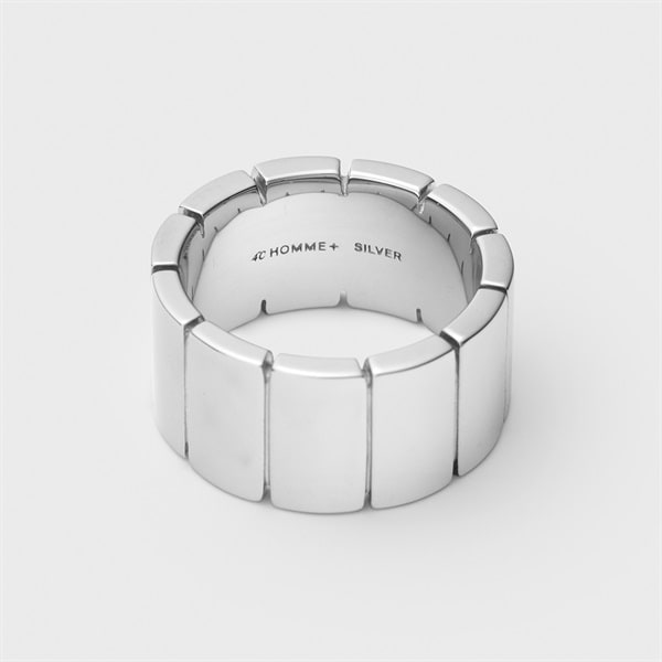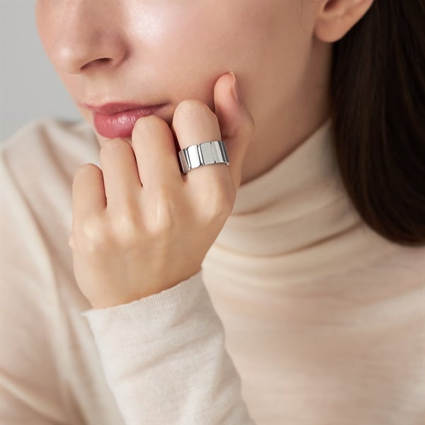 【Colored Stones】ウォッチバンドをイメージさせる幅広アームがインダストリアルな印象を与えるリング。インパクトがありながらもすっきりとしたフォルムは見た目以上に身に着けやすくデイリー使いにもおすすめです。シルバーにほどこされたプラチナコーティングがリッチで落ち着いた印象を与えます。 ※ボリューム(幅)のあるリングは、通常より着用時にサイズが小さく感じる場合がございます。