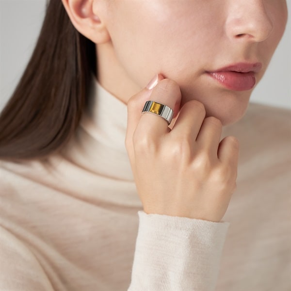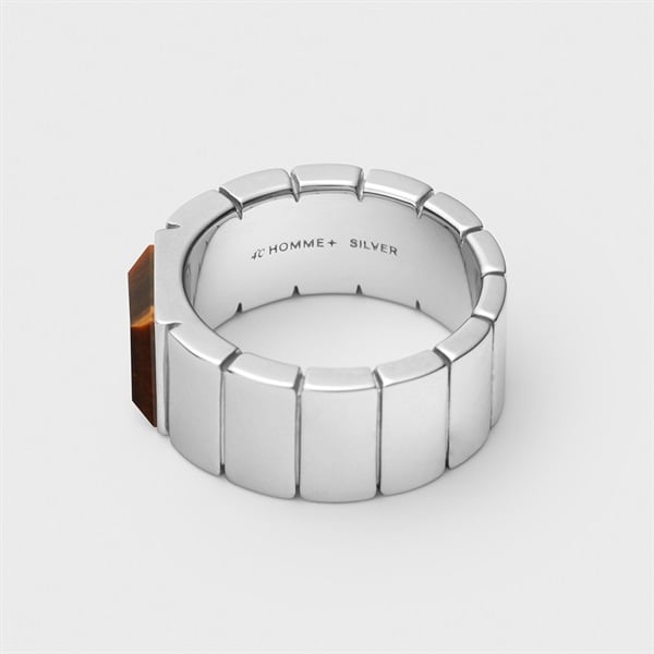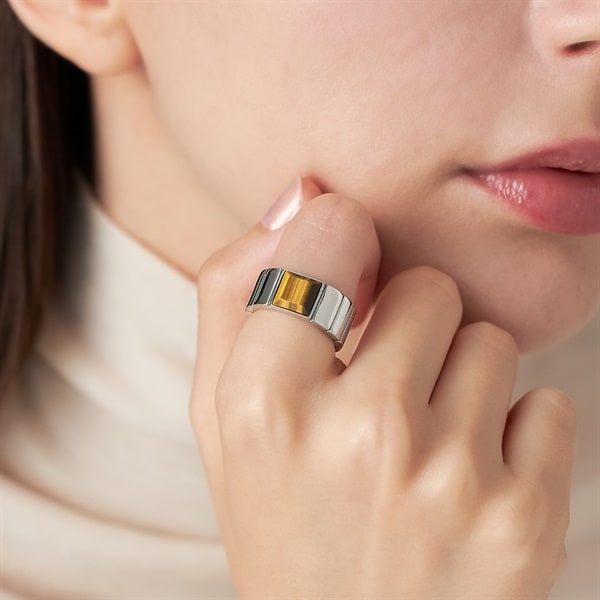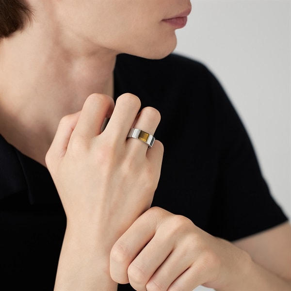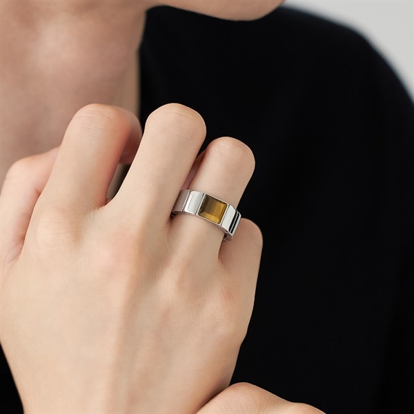 【Colored Stones】 オリジナルカットのタイガーアイの縞模様が落ち着いた印象のインダストリアルなリング。タイガーアイは虎の目を連想させることから名付けられました。 ウォッチバンドをイメージさせる幅広アームがスタイリッシュ。カラーストーンとアームが融合したすっきりとしたフォルムは指あたりもよくデイリー使いにもおすすめです。シルバーにほどこされたプラチナコーティングがリッチで落ち着いた印象を与えます。 ※天然石・天然素材を使用しているため、実際の色味や風合いが異なる場合がございます。 ※ボリューム(幅)のあるリングは、通常より着用時にサイズが小さく感じる場合がございます。