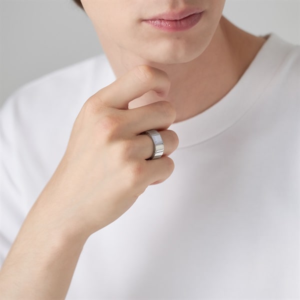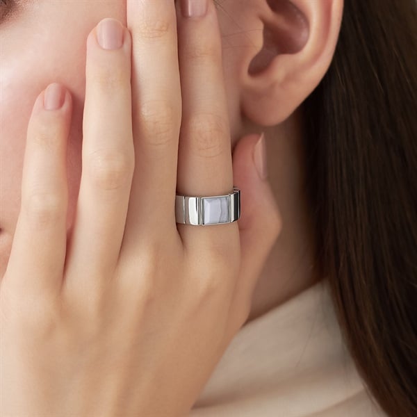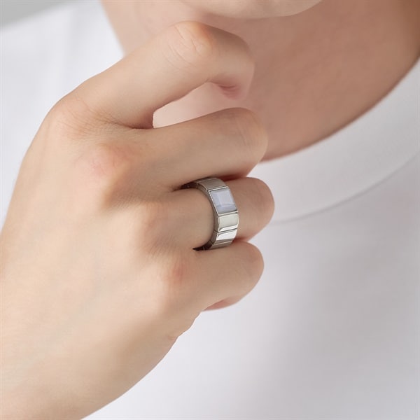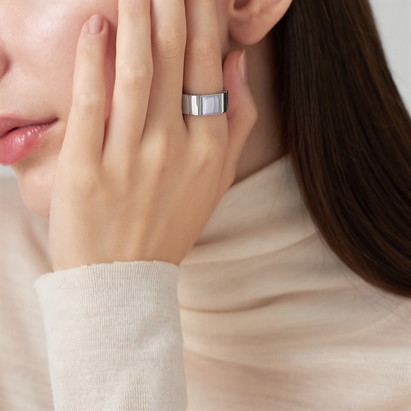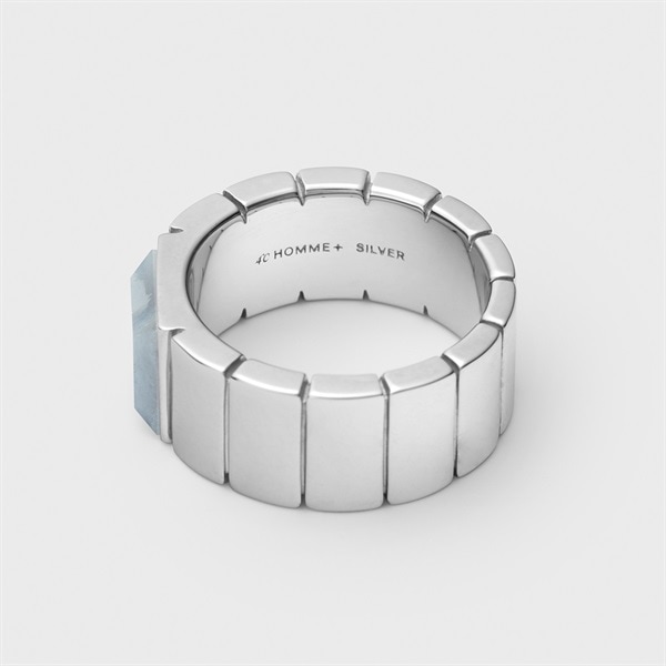【Colored Stones】 オリジナルカットのブルーレースアゲートの縞模様がさわやかなインダストリアルなリング。淡い水色と白色が層状に重なり、繊細なレースのように見えることからブルーレースと名付けられました。 ウォッチバンドをイメージさせる幅広アームがスタイリッシュ。カラーストーンとアームが融合したすっきりとしたフォルムは指あたりもよくデイリー使いにもおすすめです。シルバーにほどこされたプラチナコーティングがリッチで落ち着いた印象を与えます。 ※天然石・天然素材を使用しているため、実際の色味や風合いが異なる場合がございます。 ※ボリューム(幅)のあるリングは、通常より着用時にサイズが小さく感じる場合がございます。
