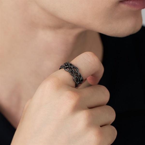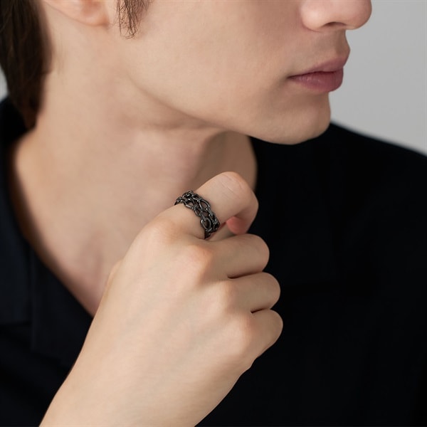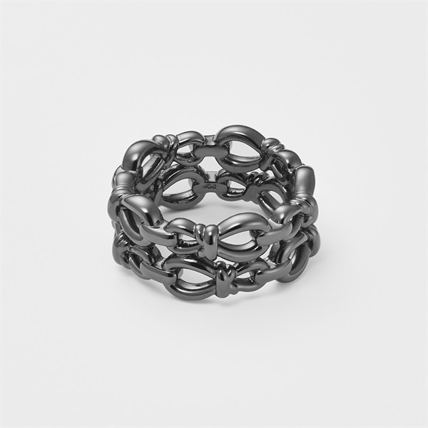 【Knot】 いつの時代も揺るぎなく寄り添い続ける「結び」をイメージしたノットモチーフリング。 エンドレスにノットがつながって見える細部にまでこだわったフォルムが魅力的。幅広のたっぷりとしたボリュームが楽しめ、漆黒のブラックコーティングで仕上げたオールブラックカラーはいつものコーディネートをモードにアップグレードしてくれます。※ボリューム(幅)のあるリングは、通常より着用時にサイズが小さく感じる場合がございます。