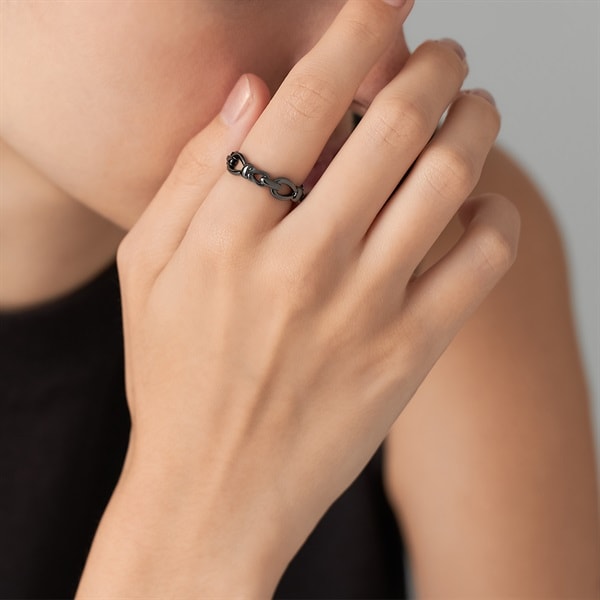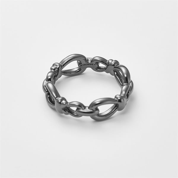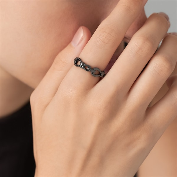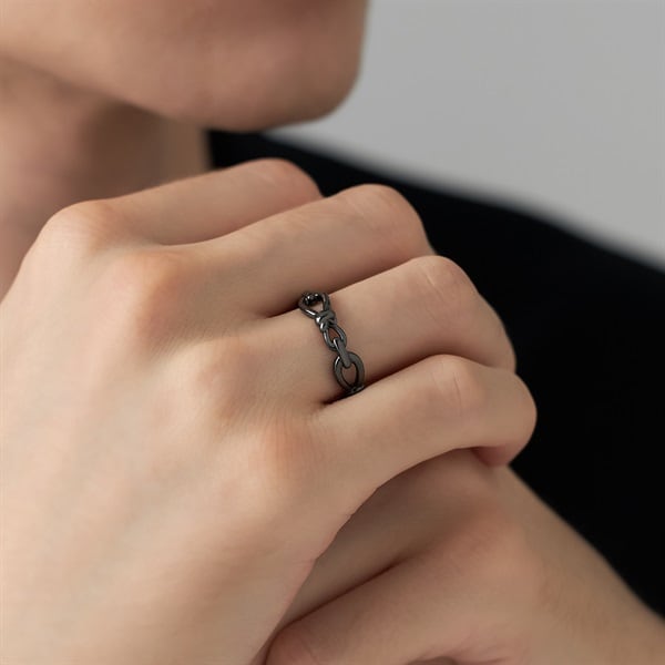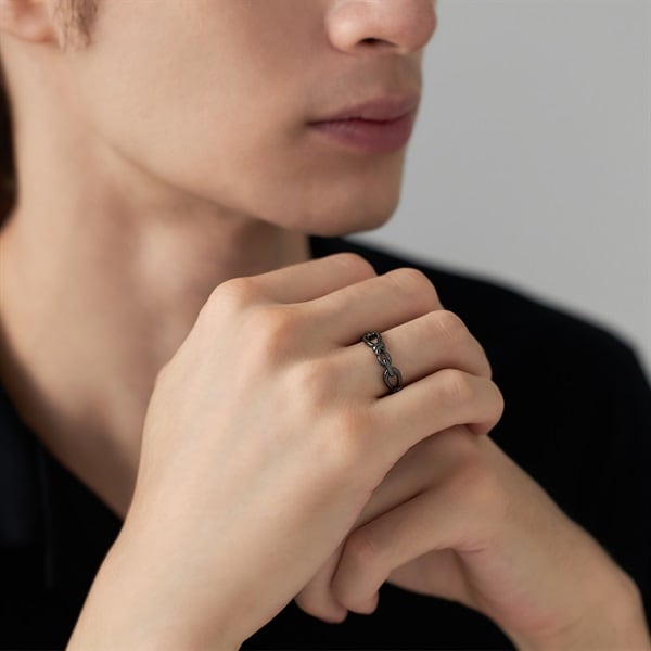 【Knot】 いつの時代も揺るぎなく寄り添い続ける「結び」をイメージしたノットモチーフリング。 エンドレスにノットがつながって見える細部にまでこだわったフォルムが魅力的。デザイン性がありながらもコーディネートに溶け込むデザインです。漆黒のブラックコーティングで仕上げたオールブラックカラーはいつものコーディネートをモードにアップグレードしてくれます。※ボリューム(幅)のあるリングは、通常より着用時にサイズが小さく感じる場合がございます。