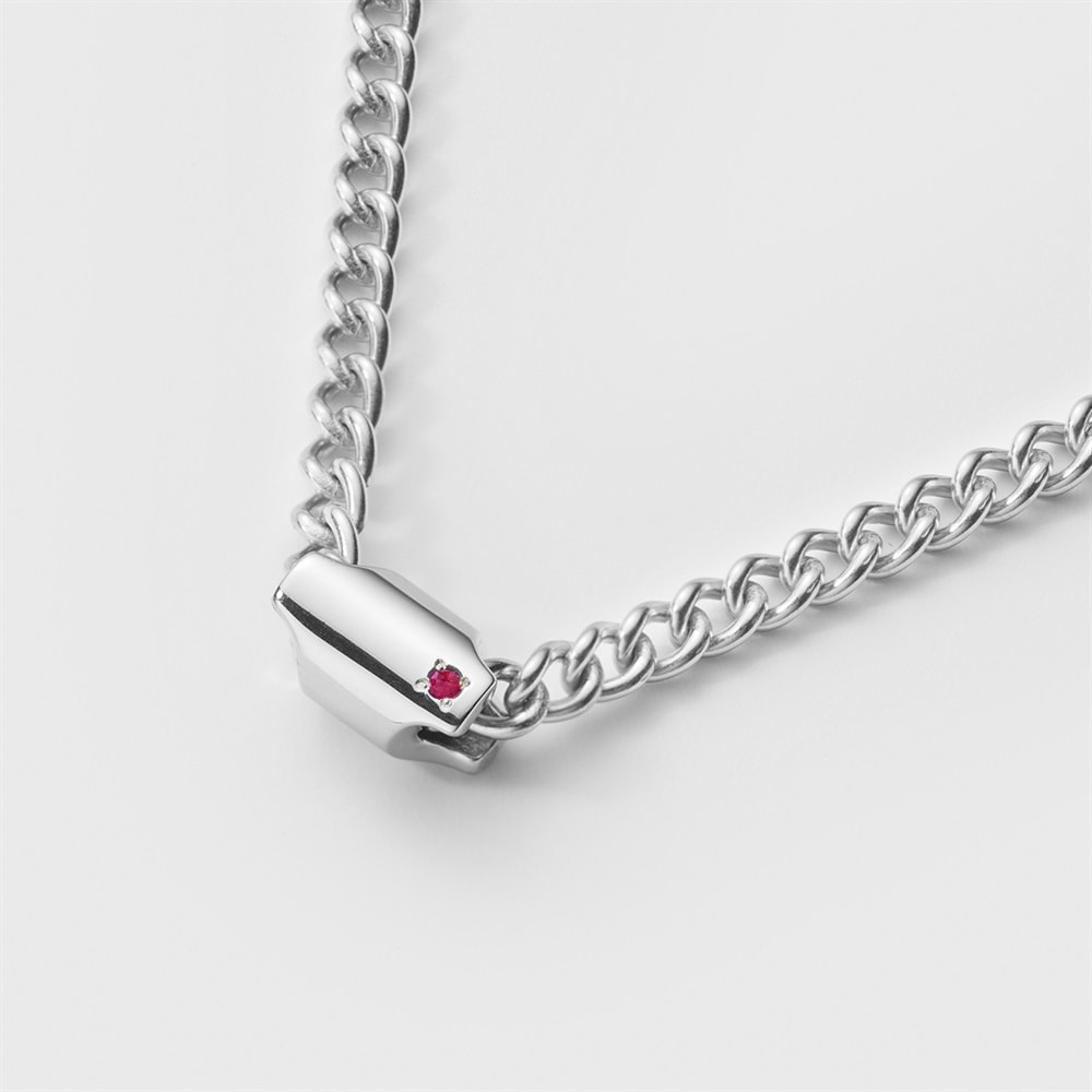 【Birthstone】 7月の誕生石・ルビーをあしらった結び目をイメージしたエッジーなネックレス。「勝利に導く力を持つ」という意味をもつ石がさり気なく輝きます。シルバー本来のナチュラルな風合いを活かしたノーコーティング仕様。パーソナルなギフトやお守り代わりに自分へのご褒美にも最適。 ※天然石・天然素材を使用しているため、実際の色味や風合いが異なる場合がございます。