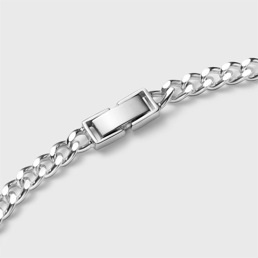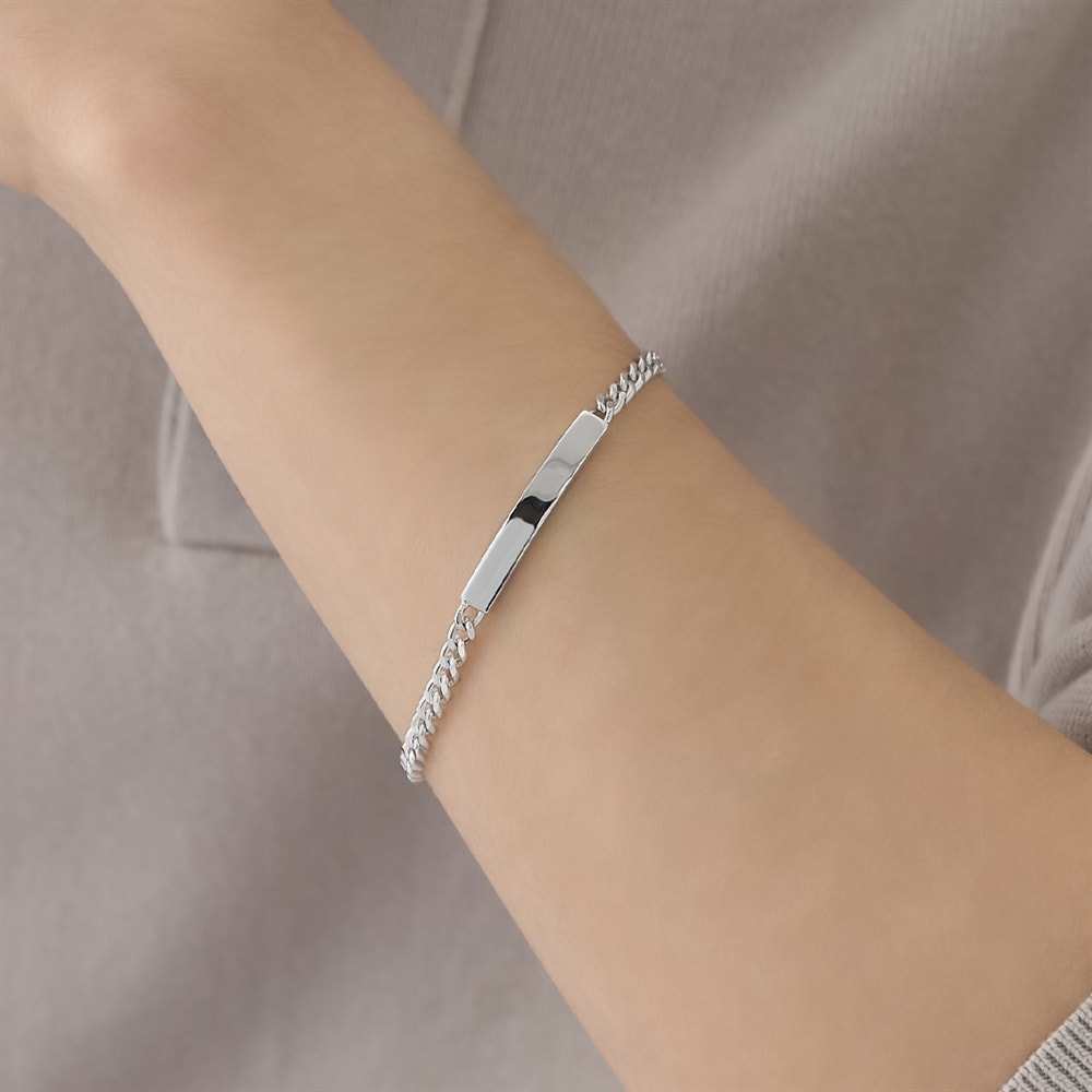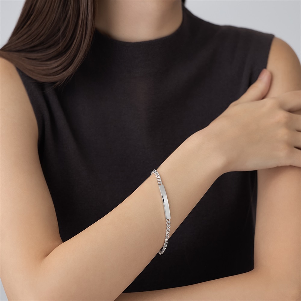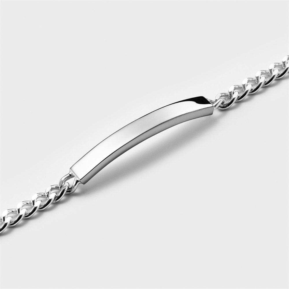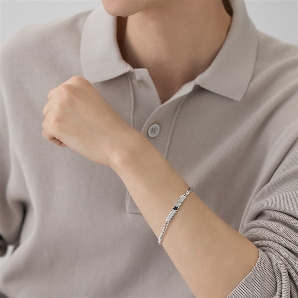 【RAW LINE】 素のままの無駄を削ぎ落としたミニマルなデザイン。IDプレートを添えたブレスレットは程よい重厚なチェーンとのコンビネーションで、手元にタフで上質な印象をプラスします。カーブが腕に添い、着け心地の良いブレスレットで、日々のコーディネートに大人の風格を加えます。シルバー本来のナチュラルな風合いを活かしたノーコーティング仕様です。
