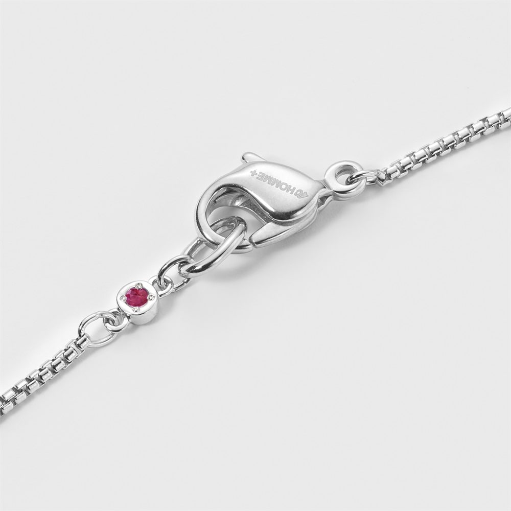 【Birthstone】 7月の誕生石・ルビーをあしらったチェーンブレスレット。「勝利に導く力を持つ」という意味をもつ石がさり気なく輝きます。プラチナコーティングの上質で落ち着いた艶と洗練されたミニマルデザインは性別を問わず幅広いスタイルになじみます。パーソナルなギフトやご自身用にもおすすめです。 ※天然石・天然素材を使用しているため、実際の色味や風合いが異なる場合がございます。