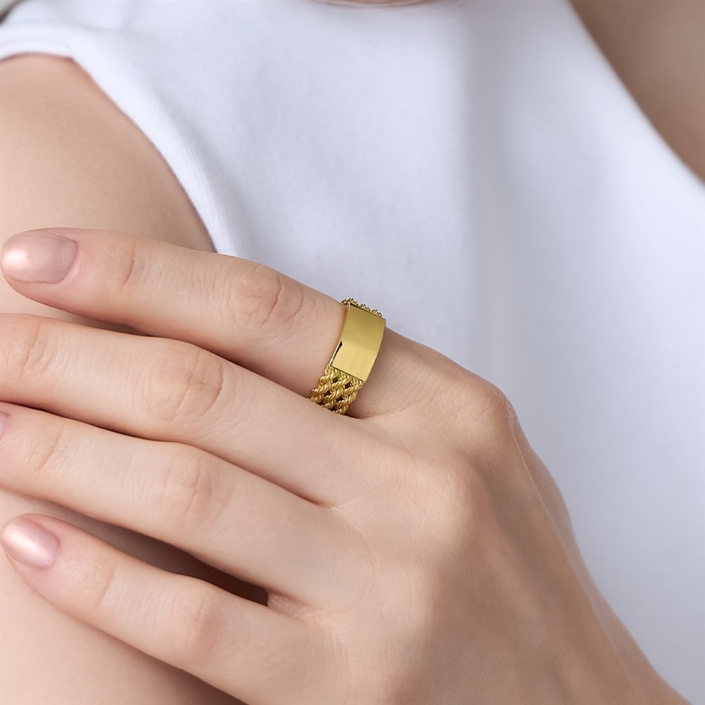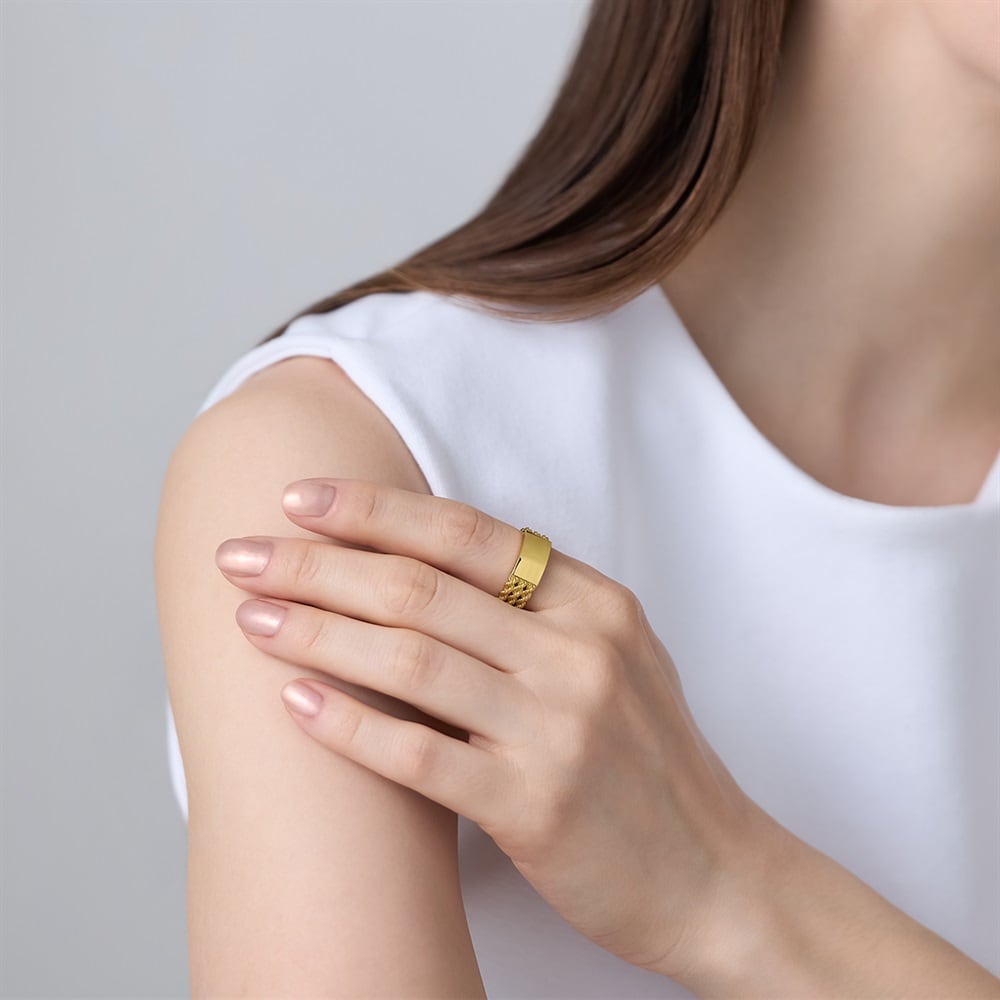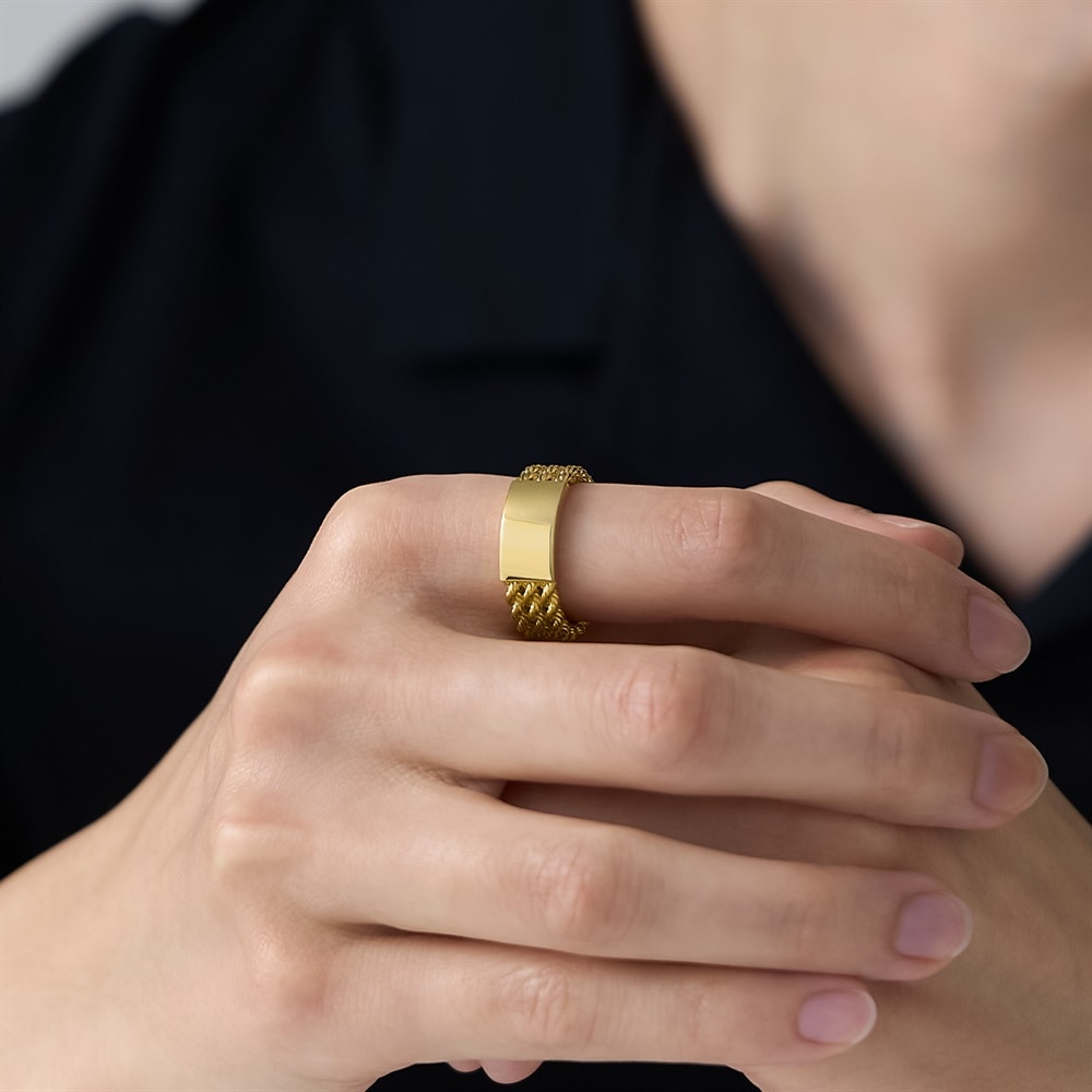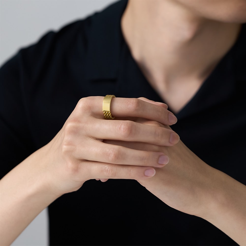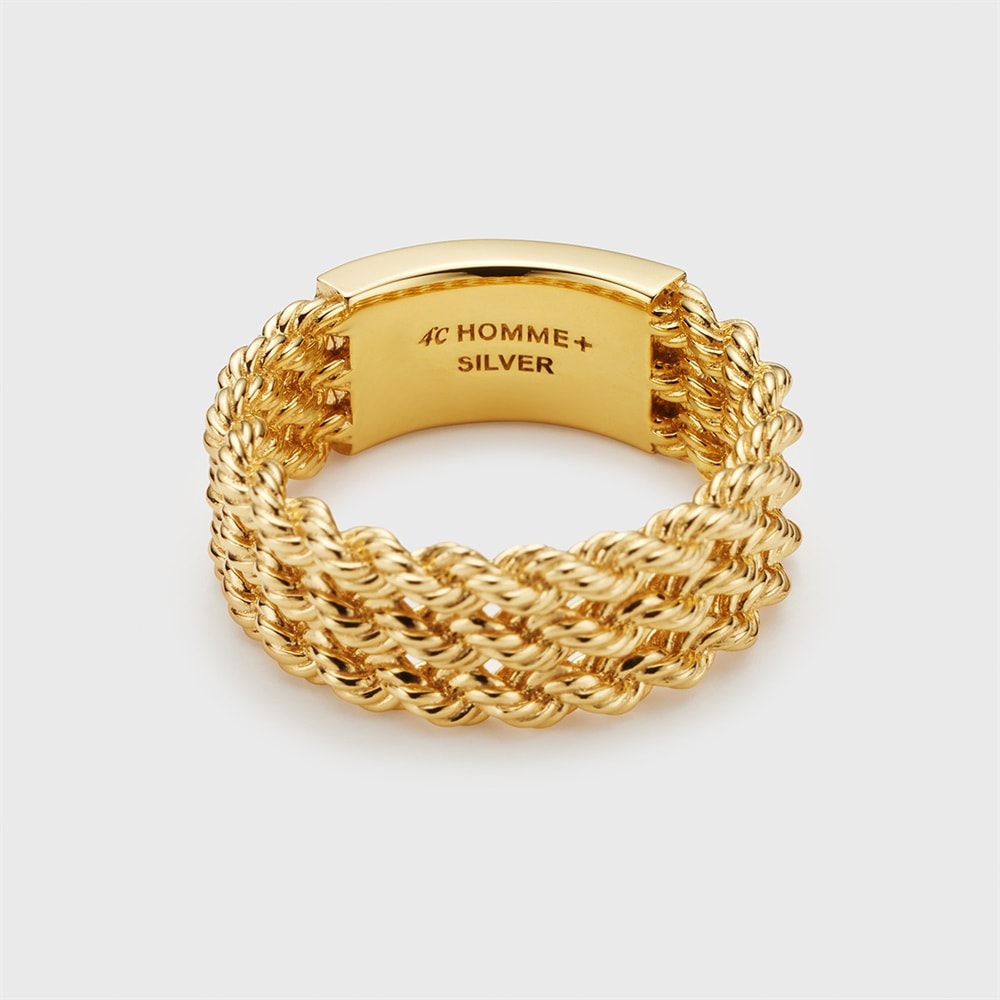 【RAW SOLID】 無駄を削ぎ落としたミニマルなデザインが特徴のシリーズ。リアルに表現したロープのテクスチャーが上質なヴィンテージの雰囲気を醸し出すリング。3本のリングを重ねたような一体感のあるボリュームは無骨ながらも洗練された印象を与えます。K18イエローゴールドコーティングをほどこしたシルバーが明るく上質な印象を添えます。※ボリューム(幅)のあるリングは、通常より着用時にサイズが小さく感じる場合がございます。