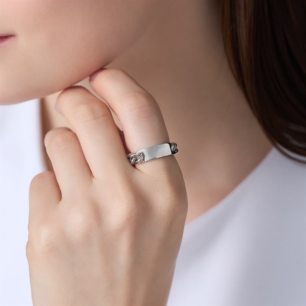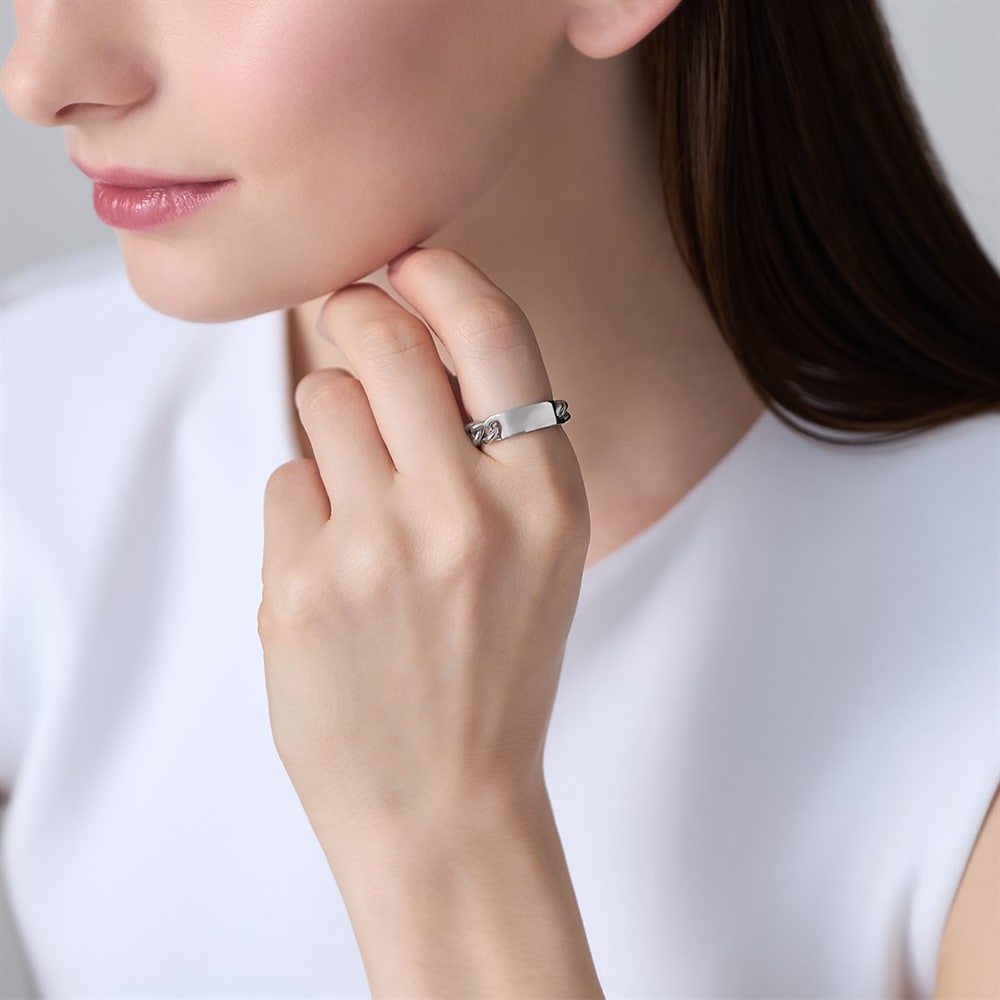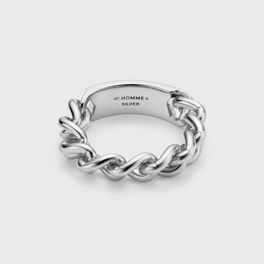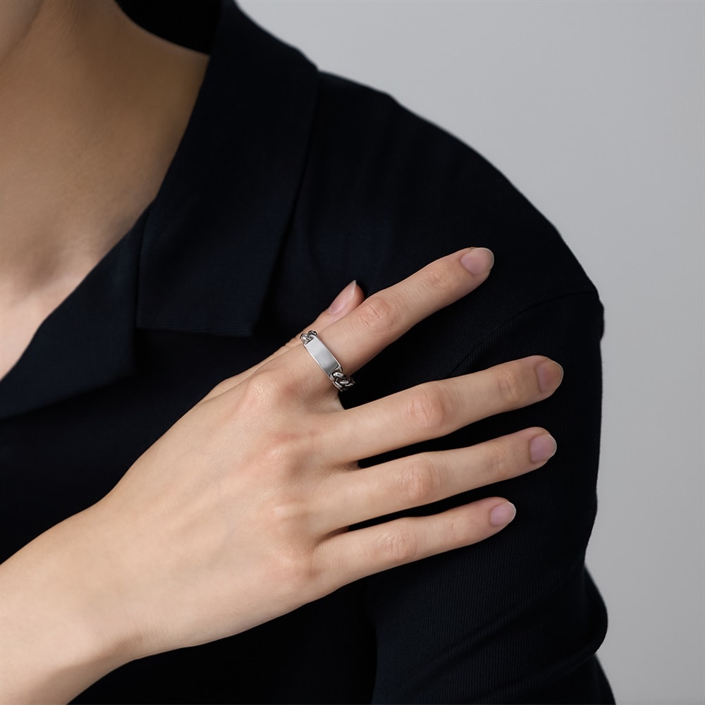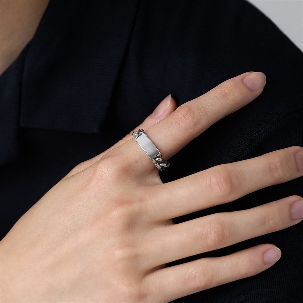 【RAW SOLID】 無駄を削ぎ落としたミニマルなデザインが特徴のシリーズ。プレートと喜平チェーンをジョイントしたチェーンリングは、プレート面がクールな印象を与えつつ、チェーンのなめらかな動きがさり気ないアクセントに。デイリーに身に着けたくなる1本で、プラチナコーティングをほどこしたシルバーが上品な艶を添えます。※ボリューム(幅)のあるリングは、通常より着用時にサイズが小さく感じる場合がございます。