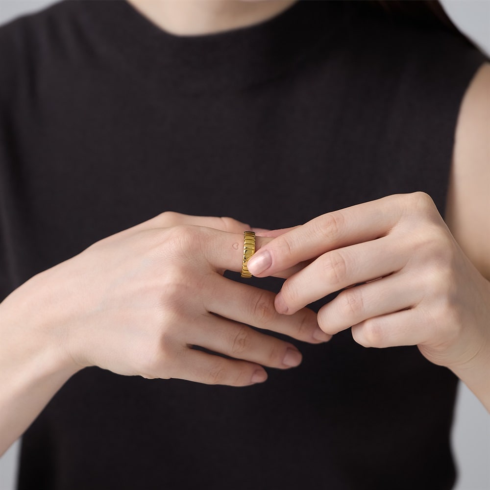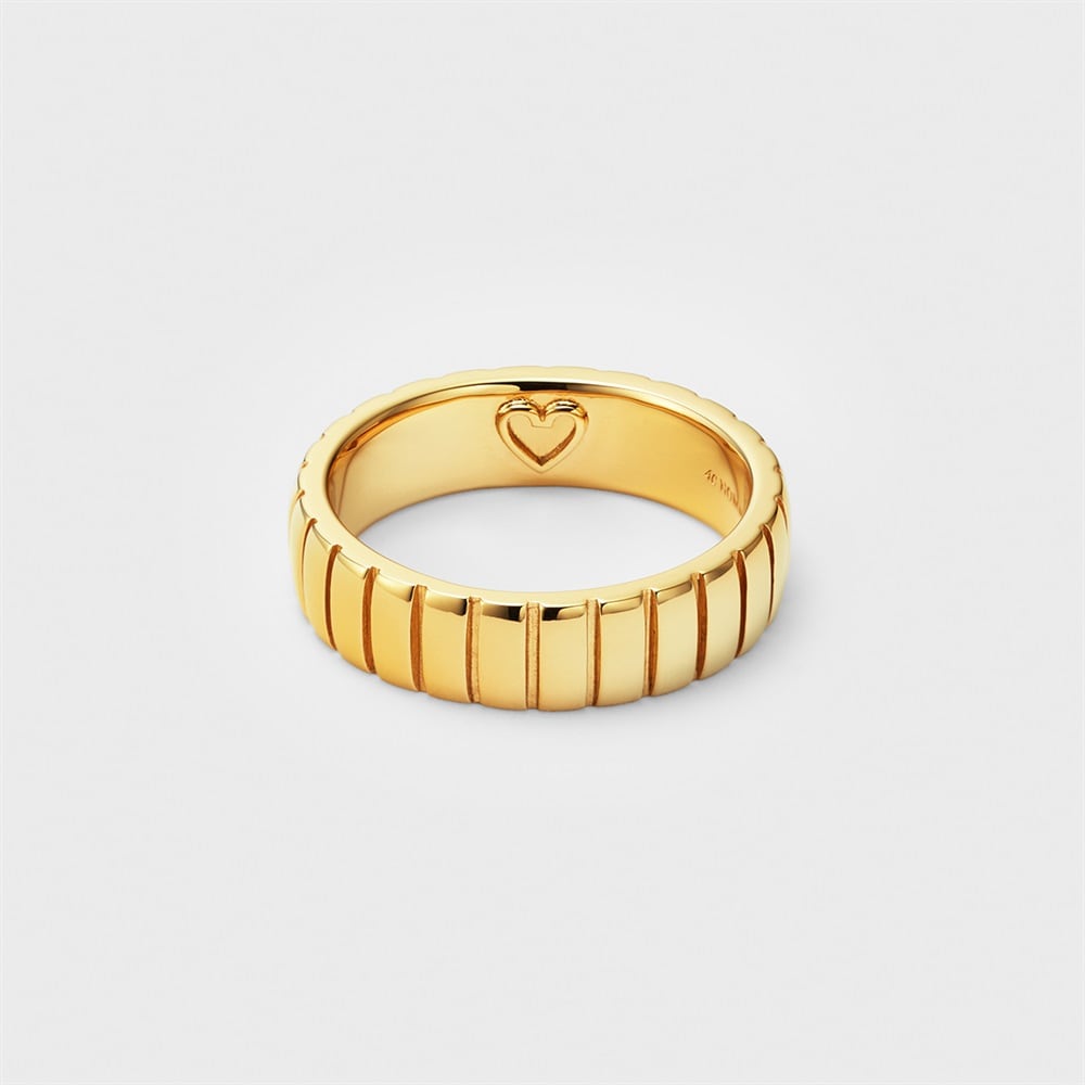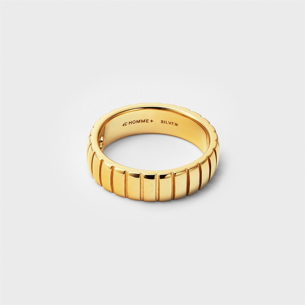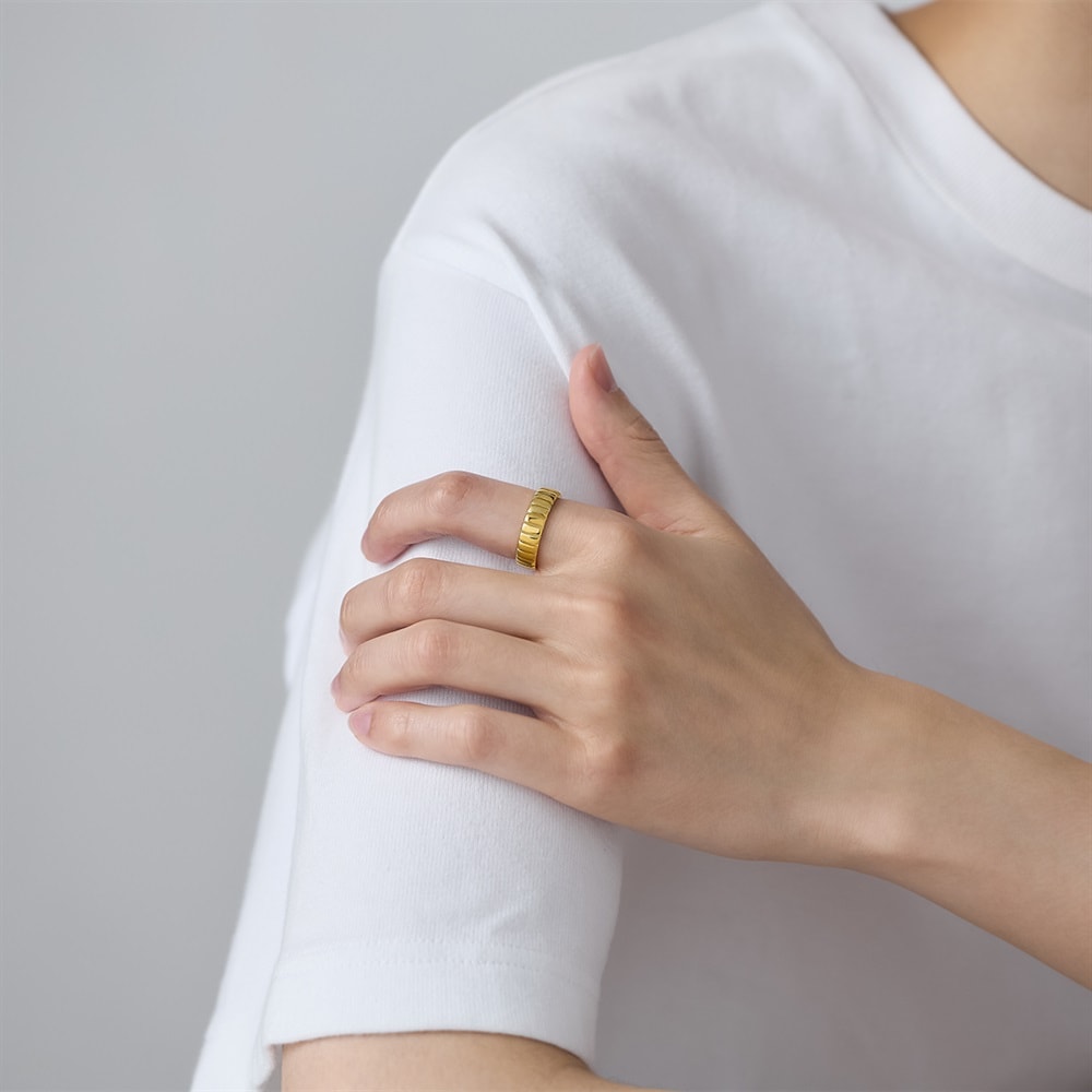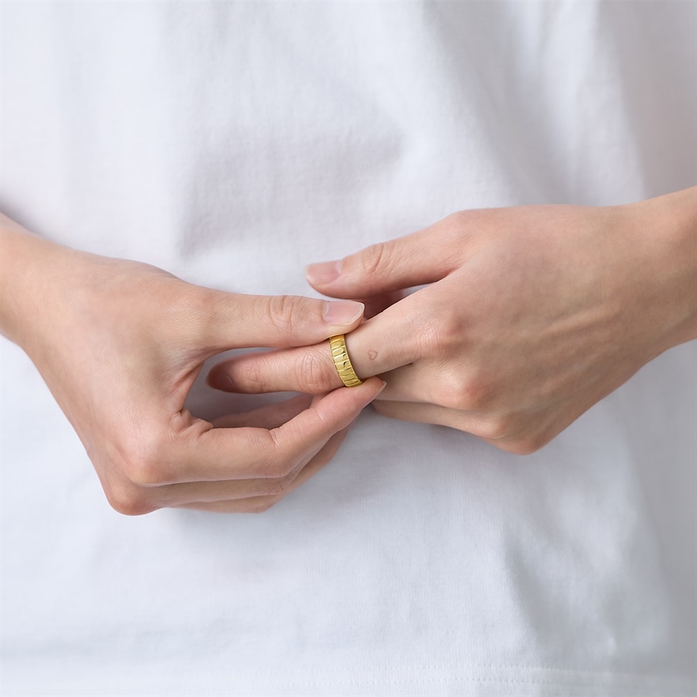 【RAW SOLID】 無駄を削ぎ落としたミニマルなデザインが特徴のシリーズ。内側にシークレットに彫られたハートマークが、着脱時に指にタトゥーのように残るユニークなリング。エッジーなデザインとは裏腹に、ハートのモチーフが浮かび上がるギャップが魅力。「これから進む道」をイメージしたタイヤを思わせるタイムレスなデザインは、ペアジュエリーやギフトにも最適です。K18イエローゴールドコーティングをほどこしたシルバーが明るく上質な印象を添えます。※ボリューム(幅)のあるリングは、通常より着用時にサイズが小さく感じる場合がございます。
