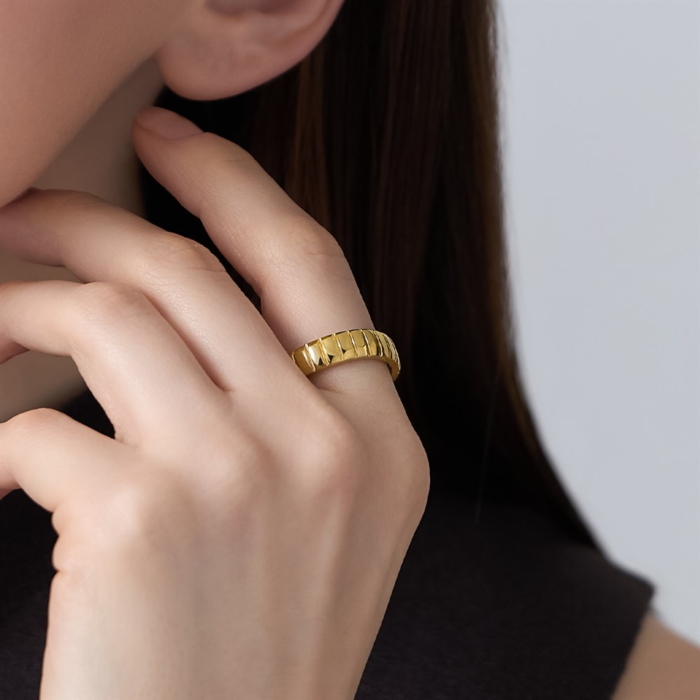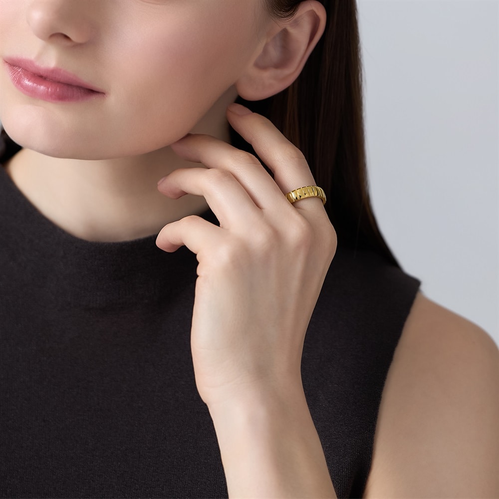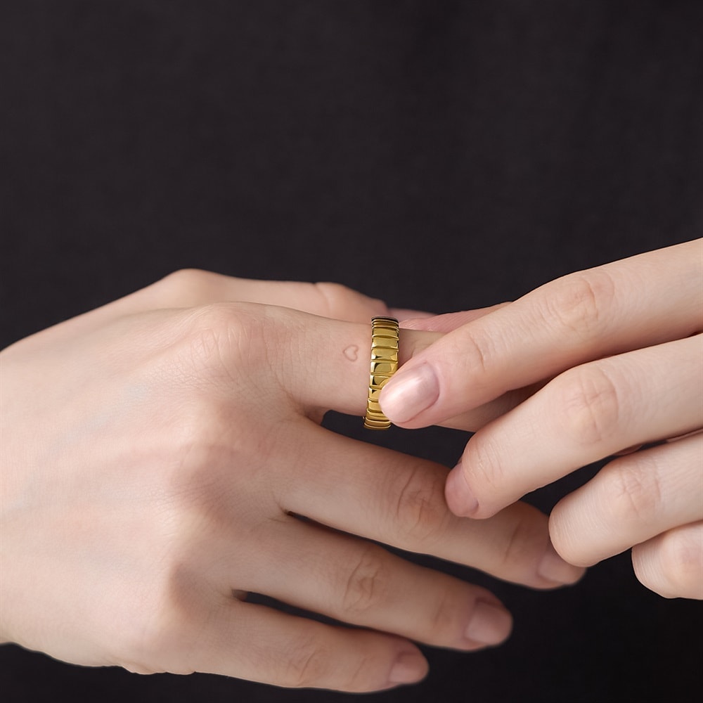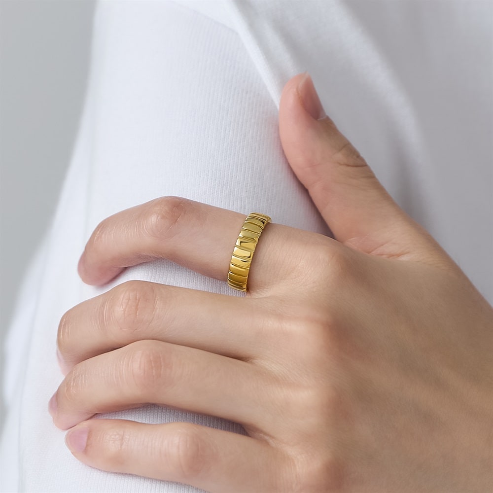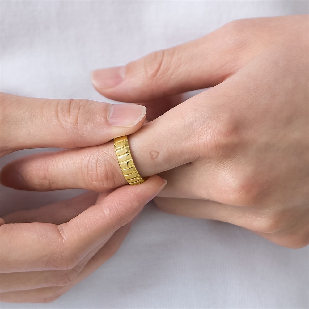 【RAW SOLID】 無駄を削ぎ落としたミニマルなデザインが特徴のシリーズ。内側にシークレットに彫られたハートマークが、着脱時に指にタトゥーのように残るユニークなリング。エッジーなデザインとは裏腹に、ハートのモチーフが浮かび上がるギャップが魅力。「これから進む道」をイメージしたタイヤを思わせるタイムレスなデザインは、ペアジュエリーやギフトにも最適です。K18イエローゴールドコーティングをほどこしたシルバーが明るく上質な印象を添えます。※ボリューム(幅)のあるリングは、通常より着用時にサイズが小さく感じる場合がございます。