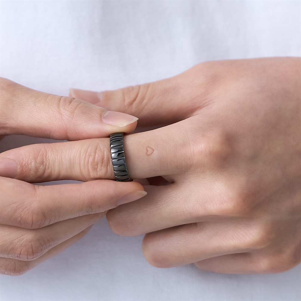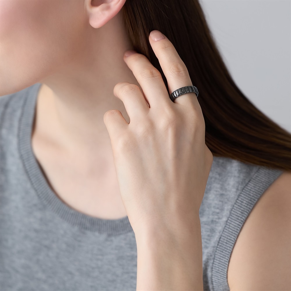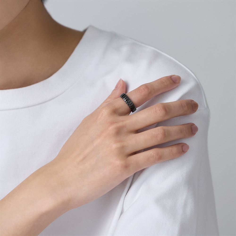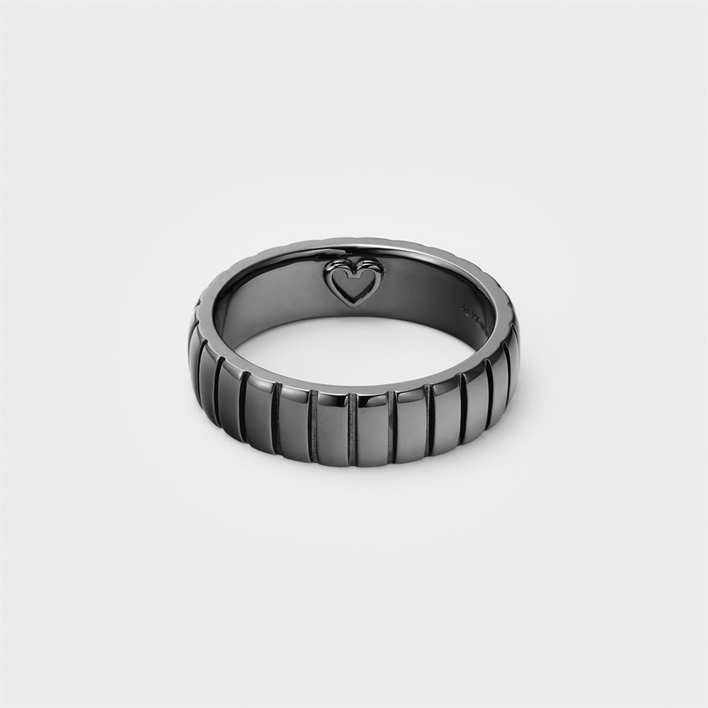 【RAW SOLID】 無駄を削ぎ落としたミニマルなデザインが特徴のシリーズ。内側にシークレットに彫られたハートマークが、着脱時に指にタトゥーのように残るユニークなリング。エッジーなデザインとは裏腹に、ハートのモチーフが浮かび上がるギャップが魅力。「これから進む道」をイメージしたタイヤを思わせるタイムレスなデザインは、ペアジュエリーやギフトにも最適です。ブラックコーティングをほどこし、いつものコーディネートをモードにアップグレードしてくれます。※ボリューム(幅)のあるリングは、通常より着用時にサイズが小さく感じる場合がございます。