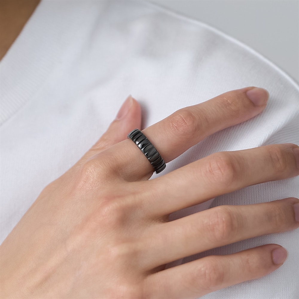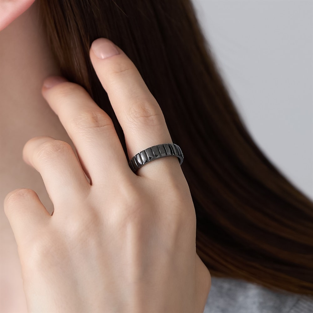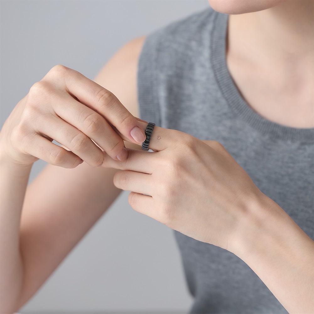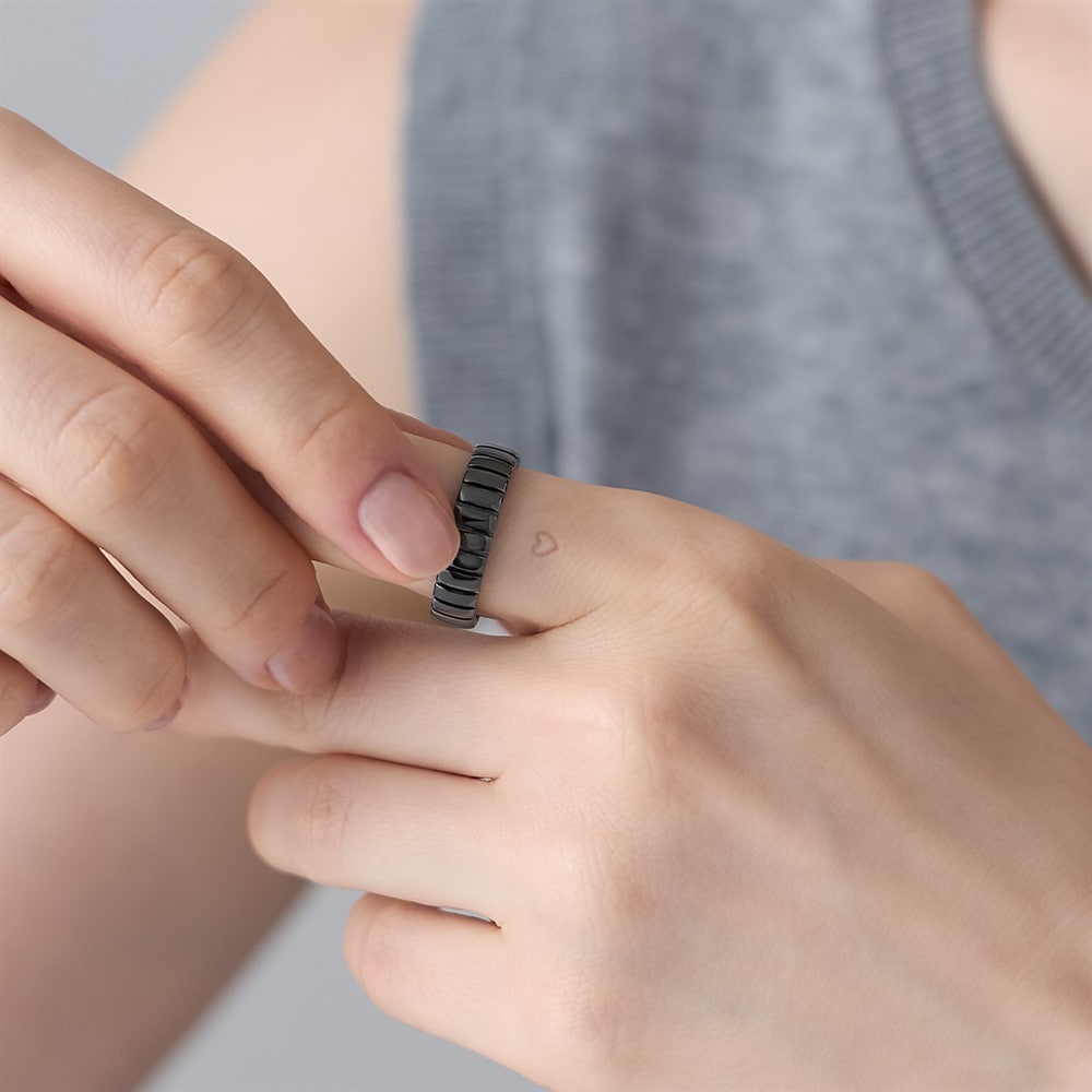 【RAW SOLID】 無駄を削ぎ落としたミニマルなデザインが特徴のシリーズ。内側にシークレットに彫られたハートマークが、着脱時に指にタトゥーのように残るユニークなリング。エッジーなデザインとは裏腹に、ハートのモチーフが浮かび上がるギャップが魅力。「これから進む道」をイメージしたタイヤを思わせるタイムレスなデザインは、ペアジュエリーやギフトにも最適です。ブラックコーティングをほどこし、いつものコーディネートをモードにアップグレードしてくれます。※ボリューム(幅)のあるリングは、通常より着用時にサイズが小さく感じる場合がございます。