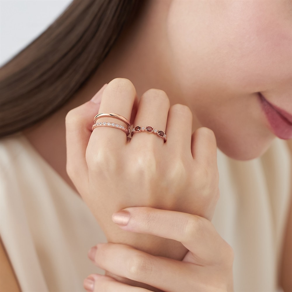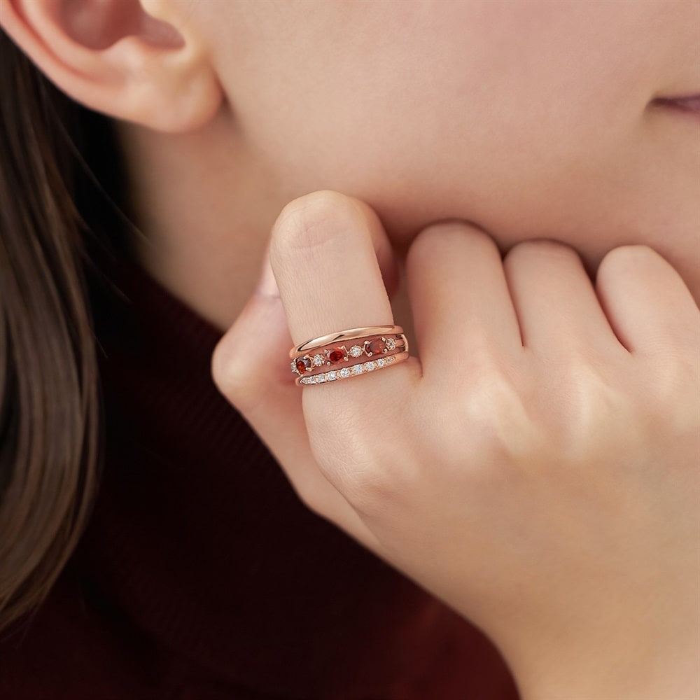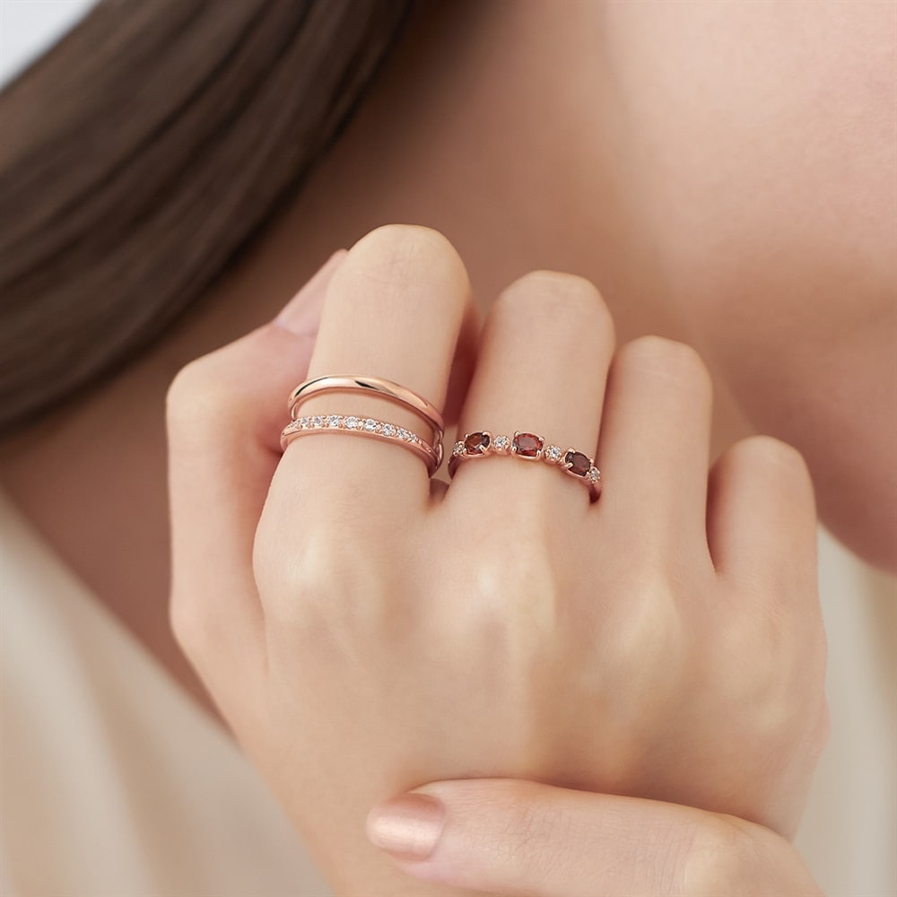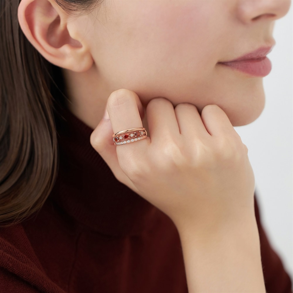 〈Radiant Grace〉新たな希望と喜びに溢れる、輝かしい新年にふさわしいニューイヤーコレクション。ガーネットの輝きを主役にしたリングと、みずみずしい煌めきが美しい身幅のある2本セットのリング。オーバルカットをほどこしたガーネットの石座には幸せを招く馬蹄モチーフのデザインをあしらい、お守りのように身に着けられます。2本セットで身に着けると華やかで上品な装いに、1本ずつ異なる指に身に着けるとスタイリッシュなデザインへと変化し幅広いコーディネートが楽しめます。ガーネットの石言葉は「成功と前進へ導く」。ご自身へのご褒美はもちろんギフトにもおすすめです。※天然石・天然素材を使用しているため、実際の色味や風合いが異なる場合がございます。※ボリューム(幅)のあるリングは、通常より着用時にサイズが小さく感じる場合がございます。[数量限定ケース付き] なくなり次第終了※ショッピングバッグ内の画像が限定ケースではない場合、限定ケースのお取り扱いは終了しております。