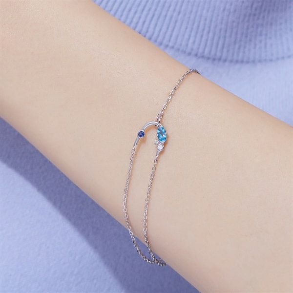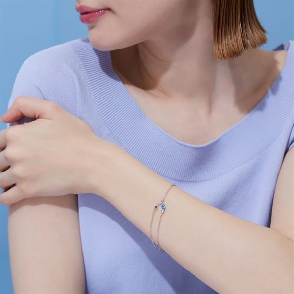 夏を彩る鮮やかな「Blue」を表現したコレクション-Blue in Blue-波の青さやぶくぶくとした波の泡を表現したシリーズ。ブルーのストーンがあしらわれた、さわやかな印象のブレスレット。弾ける波をイメージした異形カットのストーンと、アシンメトリーのチェーンが手元に華やかさをプラスするデザインです。一本でさらりと着けたくなる、軽やかさが魅力のアイテムです。[数量限定ケース付き] なくなり次第終了※ご好評につき、オンラインショップでの限定ケースのお取り扱いは終了しました。※天然石を使用しているため、実際の色味や風合いが異なる場合がございます。