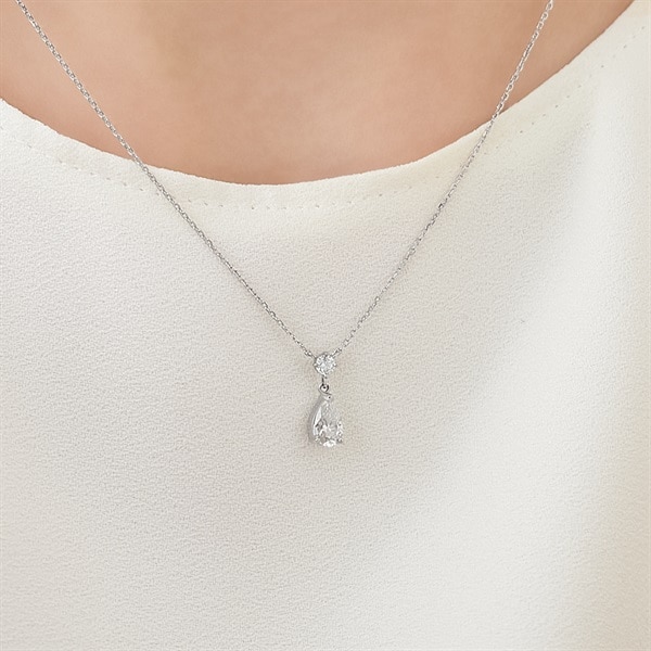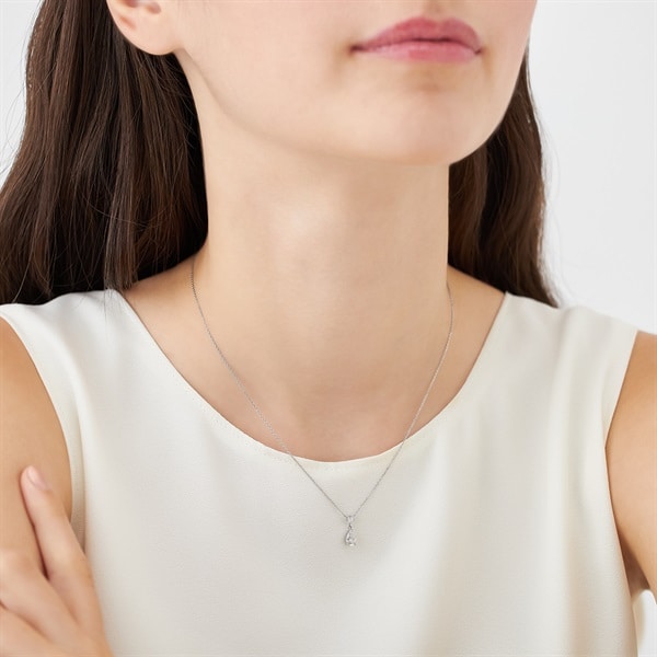 しずく型のモアサナイトが華やかにきらめくプラチナネックレス。ダイヤモンドの2.5倍の輝きを放つモアサナイトが胸元で揺れてきらめきます。潤いを与える意味を持つしずく型のカットが上品な印象を与え、コーディネートをワンランクあげてくれるるネックレスです。