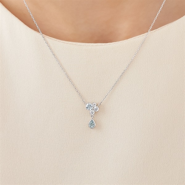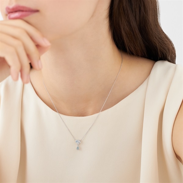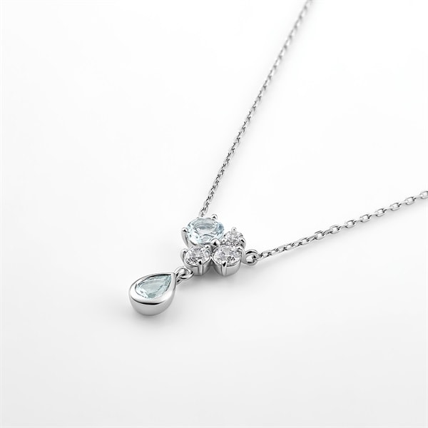 スカイブルートパーズが爽やかに輝くネックレス。上部の4石はお花をイメージしてデザインされ、ペアシェイプカットのトパーズが動くたびにきらめきを放ちます。トパーズは「友情」「希望」「成功」を象徴するストーンで、自分へのご褒美や大切な方へのギフトにおすすめです。※天然石を使用しているため、実際の色味や風合いが異なる場合がございます。