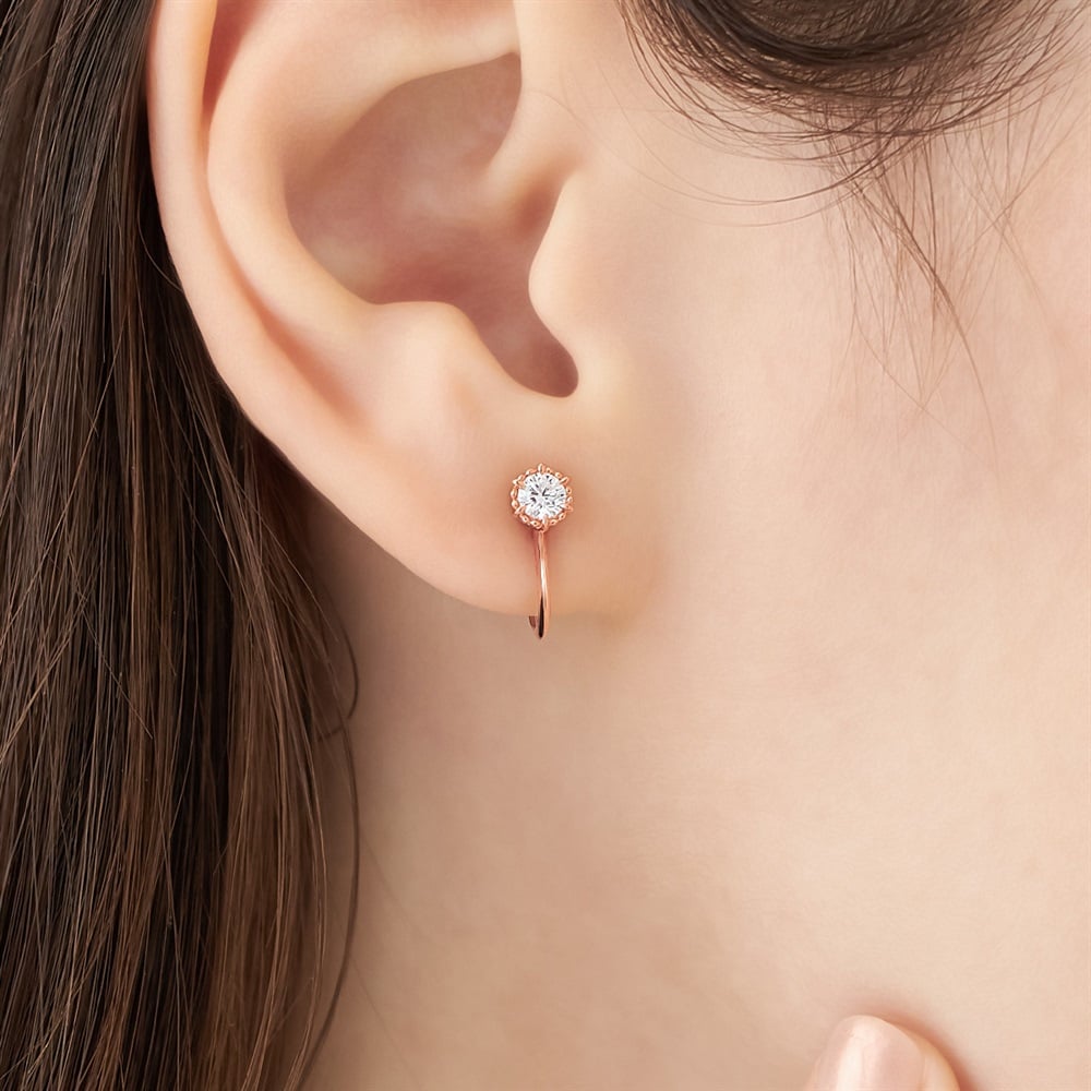 デイリーに使いやすい1石のイヤリング。ピンクゴールドカラーのやわらかな輝きが顔周りを可憐に演出します。ストーンには繊細な地金の装飾をあしらい、シンプルながらもこだわりを感じられるデザイン。小ぶりなフォルムは、ご自身用にも、大切な方へのギフトにもおすすめです。