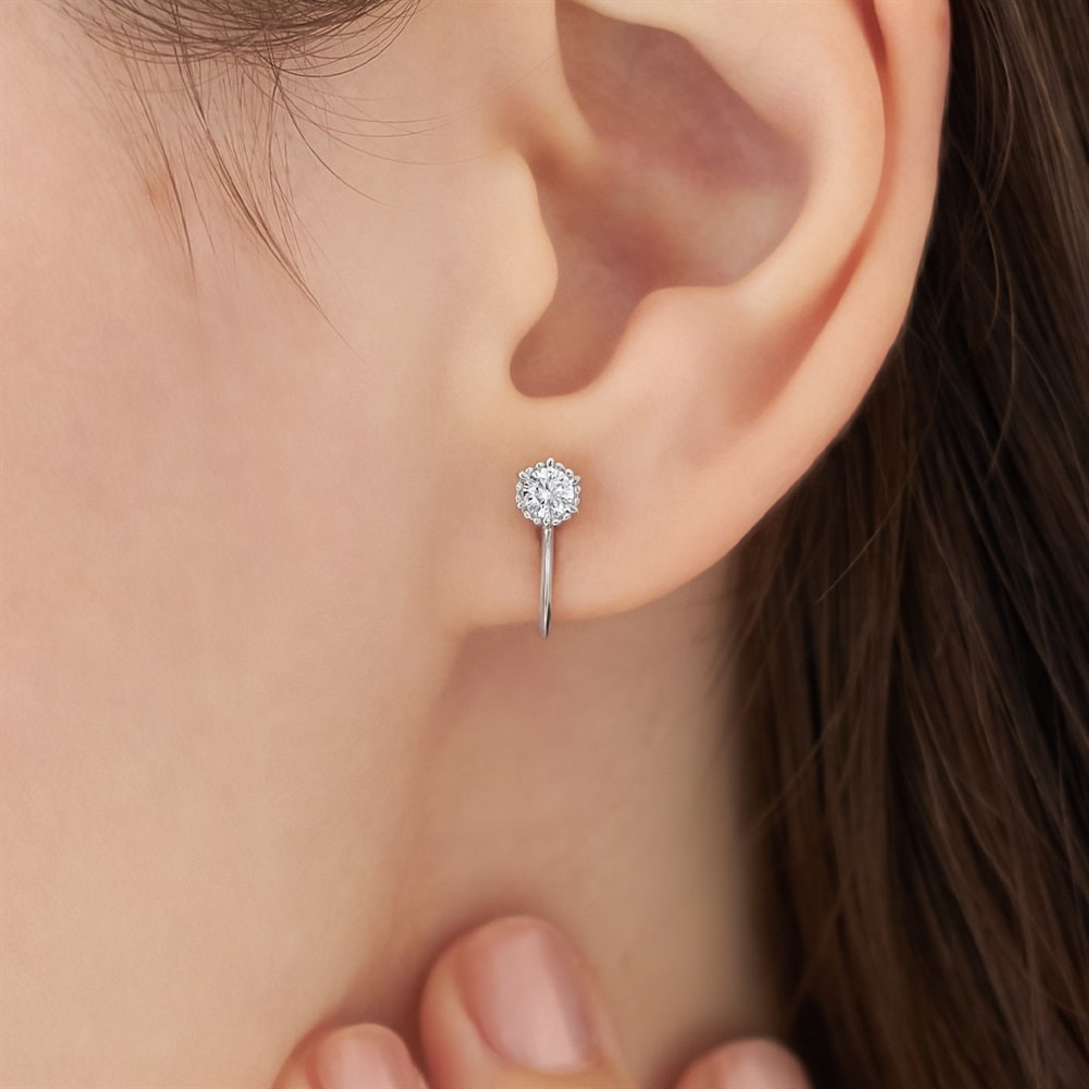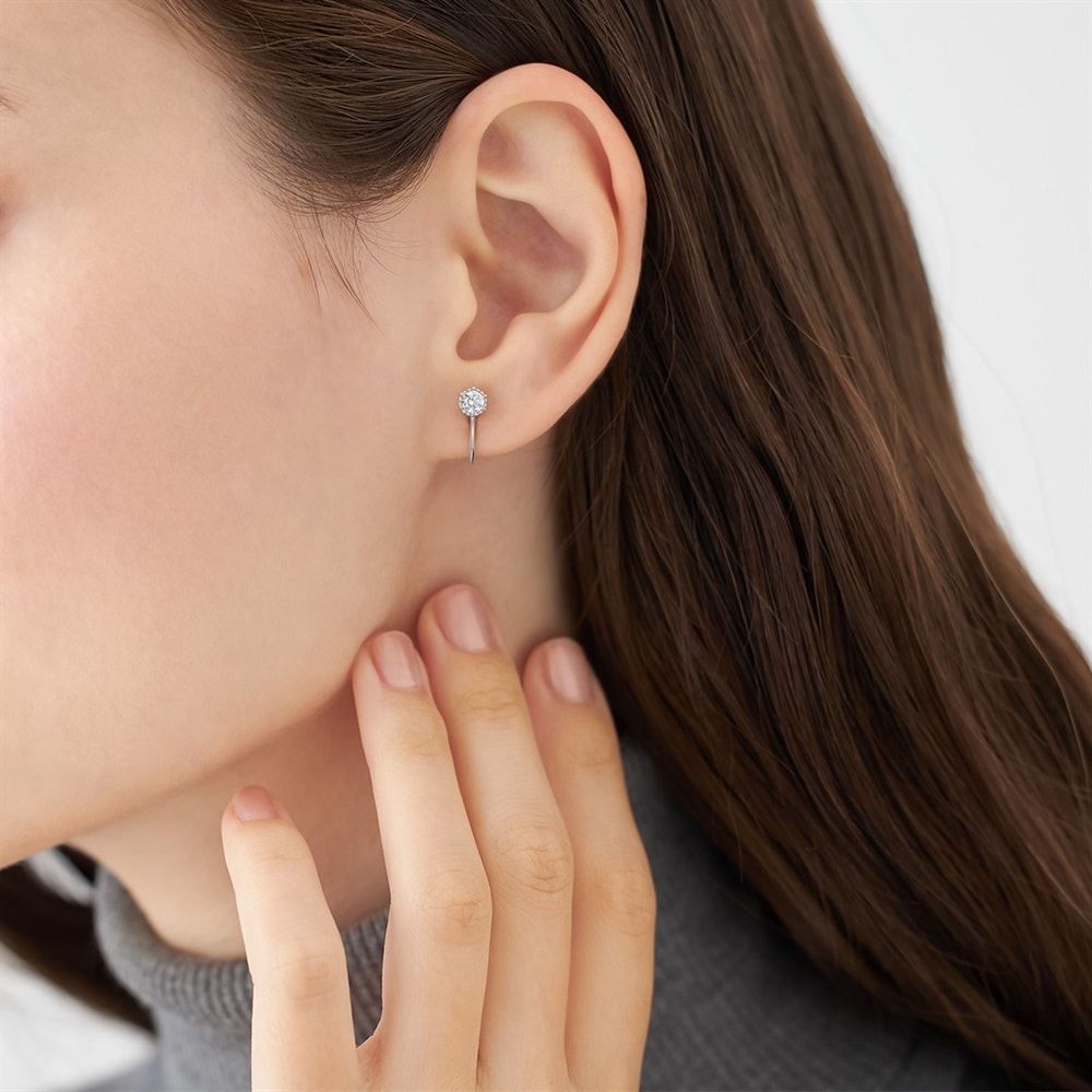 デイリーに使いやすい1石のイヤリング。ロジウムコーティングの品のある輝きが顔周りに清潔感を添えます。ストーンには繊細な地金の装飾をあしらい、シンプルながらもこだわりを感じられるデザイン。小ぶりなフォルムは、ご自身用にも大切な方へのギフトにもおすすめです。