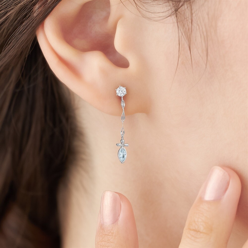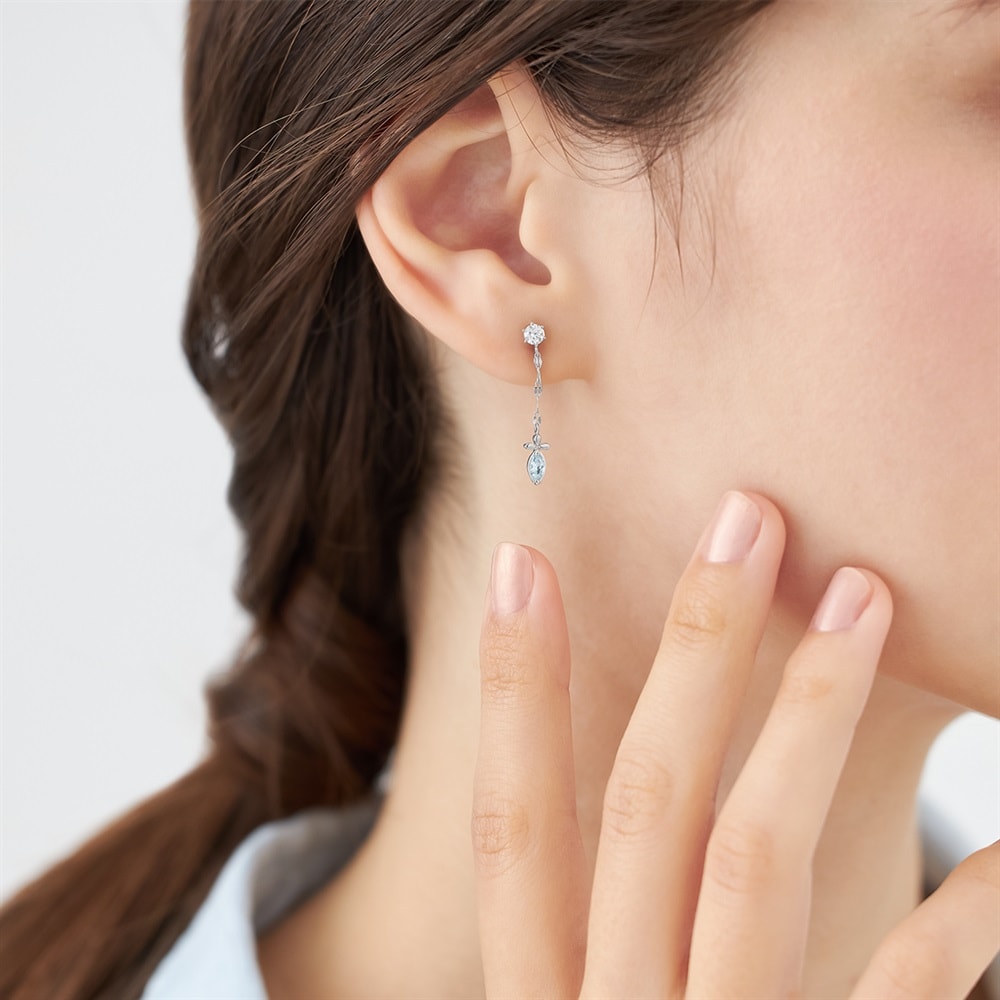 デイリーに使いやすい、さり気ない揺れ感のあるイヤリング。縦のラインを描くマーキスカットが洗練された印象を添えてくれるデザイン。ブルーカラーのストーンが凛とした輝きを放ちます。小ぶりなサイズ感は、ご自身用にはもちろん、大切な方へのギフトにもおすすめです。