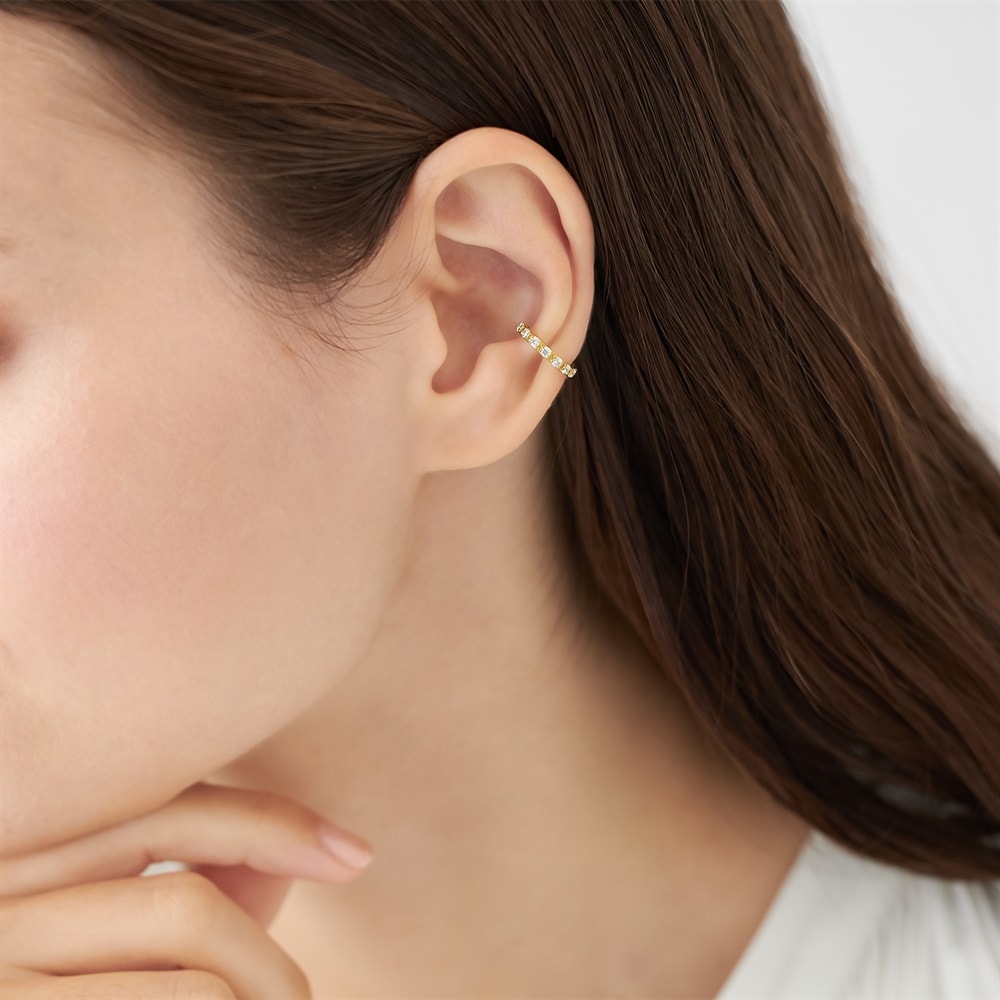 デイリーに使いやすい小ぶりなフォルムのイヤーカフ。イエローゴールドカラーの華やかな輝きと、ラインに沿ってあしらわれたストーンが顔周りにきらめきを添えるデザイン。シンプルにひとつだけや、お気に入りのジュエリーとのレイヤードにもおすすめです。