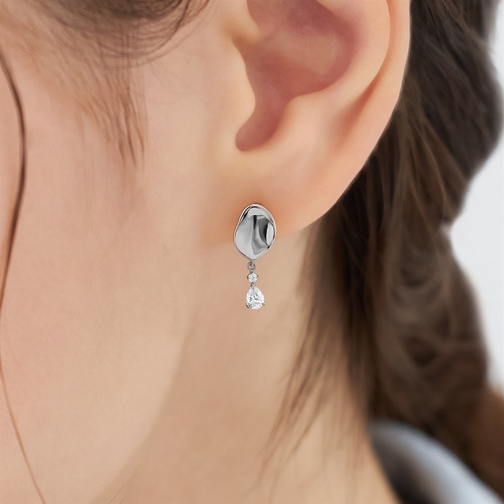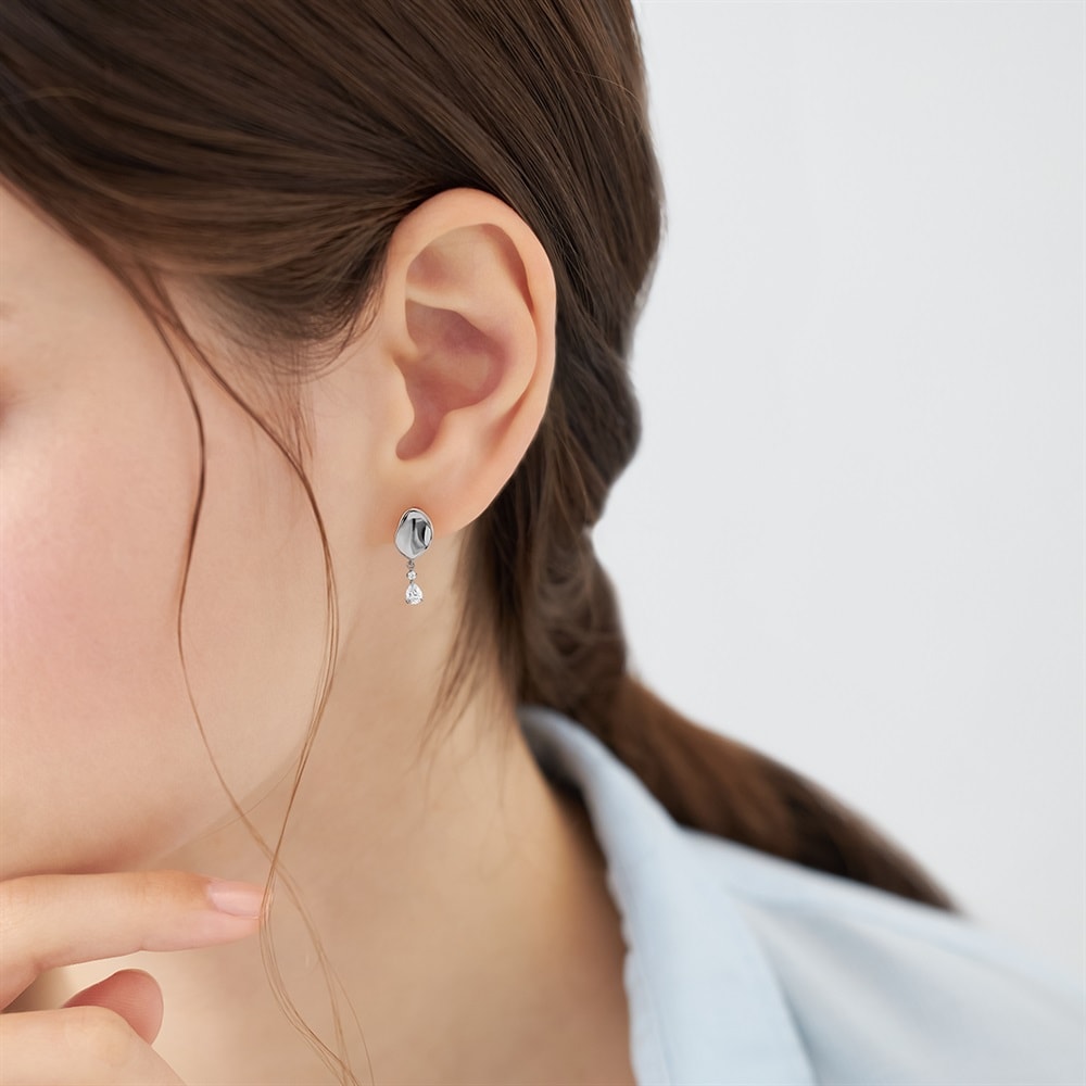 デイリーに使いやすいひらっとした地金の立体感が印象的なイヤリング。ロジウムコーティングの品ある輝きが顔まわりに清潔感をプラスするデザイン。ニュアンスを効かせた立体感が耳元に自然になじんでくれます。程よいサイズ感でご自身用はもちろん、大切な方へのギフトにもおすすめです。