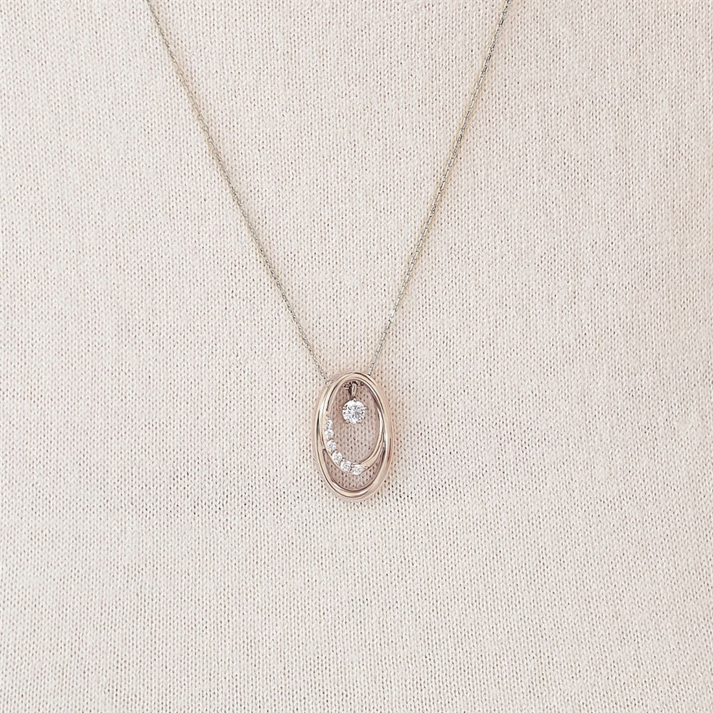 Canal 4℃初となるピンクシルバーを使用した、落ち着いた上品な色合いが魅力のSheer Roseシリーズ。建築物や美術など様々な場面で存在する、もっとも美しいとされる「黄金比」を用いてデザインされたオーバルモチーフに、美しい輝きと優れた耐久性をもつ「モアサナイト」をあしらった3wayネックレス。コーティングのほどこされていないピンクシルバーが、地金本来のナチュラルな輝きを放ちます。センターの石とオーバル部分が取り外し可能で、それぞれ単体でお使いいただくことができます。デイリーからオケージョンまでシーンレスで寄り添い、永遠の輝きと調和をもたらすネックレスです。