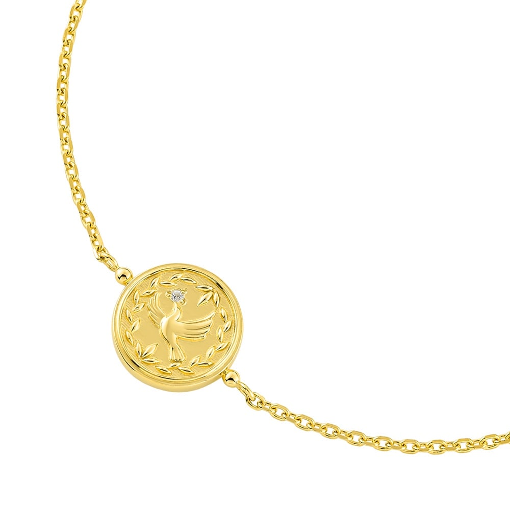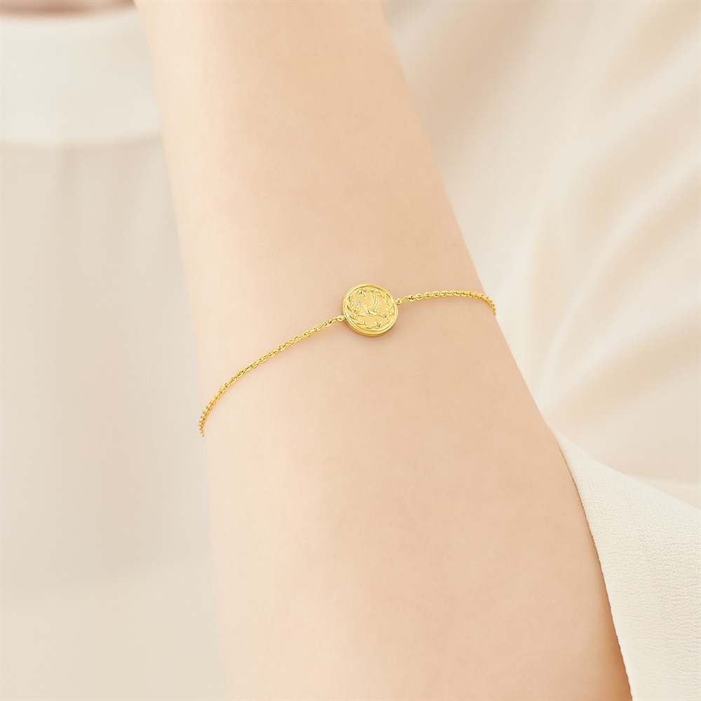 自然で自由にジュエリーの重ね着けを楽しんでいただける「Layered(レイヤード)」ジュエリーコレクション。「平和・愛」の象徴といわれている鳩モチーフのコインブレスレット。月桂樹をイメージした装飾がクラシカルな雰囲気に。他のシンプルなブレスレットとのレイヤードもおすすめです。